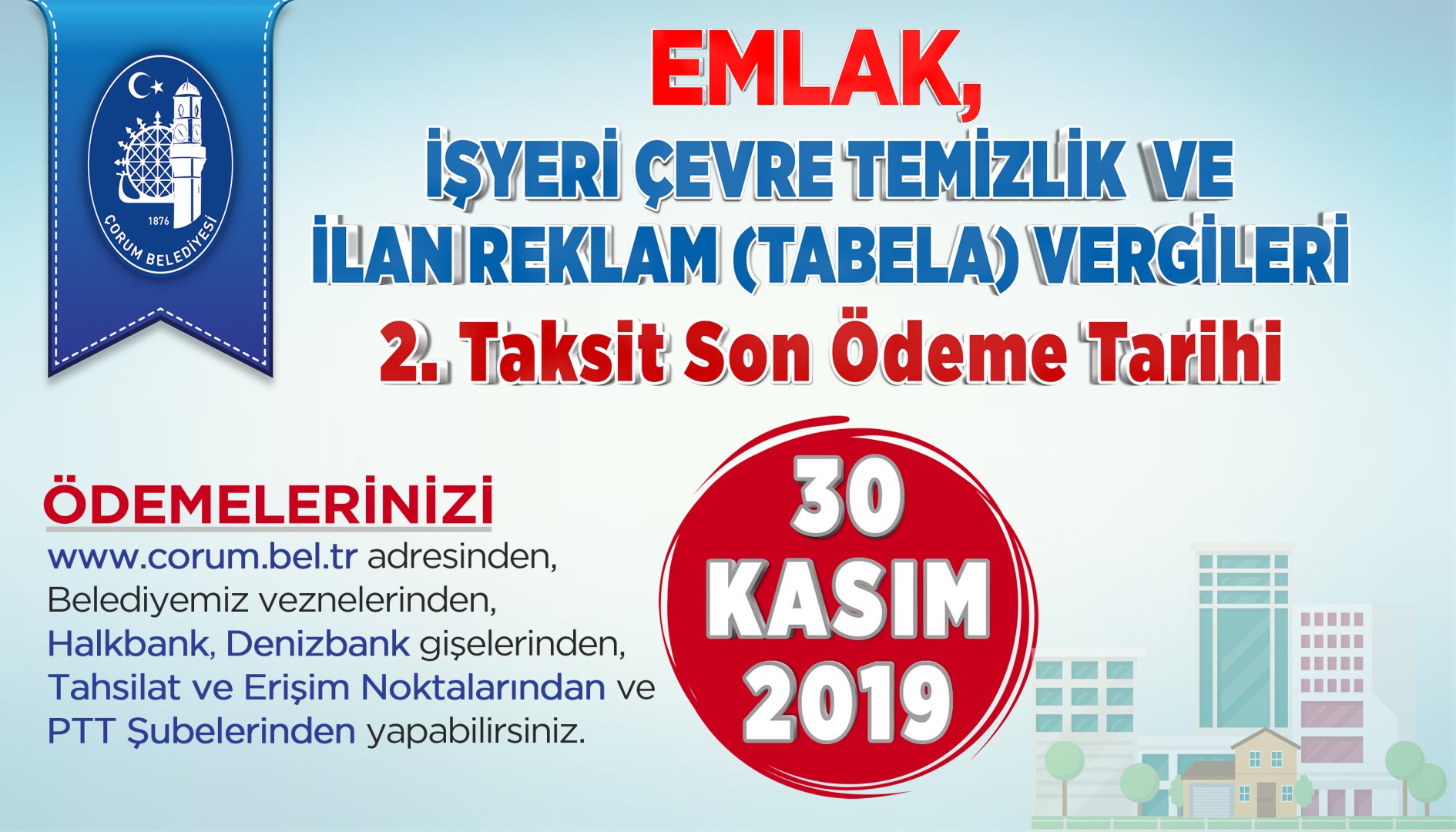 Çorum Belediye Başkan Yardımcısı Lemzi Çöplü, “her yıl iki taksit halinde ödenen 2019 yılı Emlak Vergisi’nin 2.taksitinin son ödeme tarihi 30 Kasım olduğunu hatırlatarak vatandaşlarımız ödemeler konusunda sıkıntı yaşamamaları için ödemelerini son güne bırakmasınlar” dedi. Ödemelerin belediye veznelerinden, Halk Bank, Deniz Bank gişelerinden, tahsilat ve erişim noktalarından ve PTT şubelerinden yapılacağı gibi belediyenin www.corum.bel.tr  resmi internet sayfasından da online olarak ödeme imkanının olduğunun altını çizdi.
