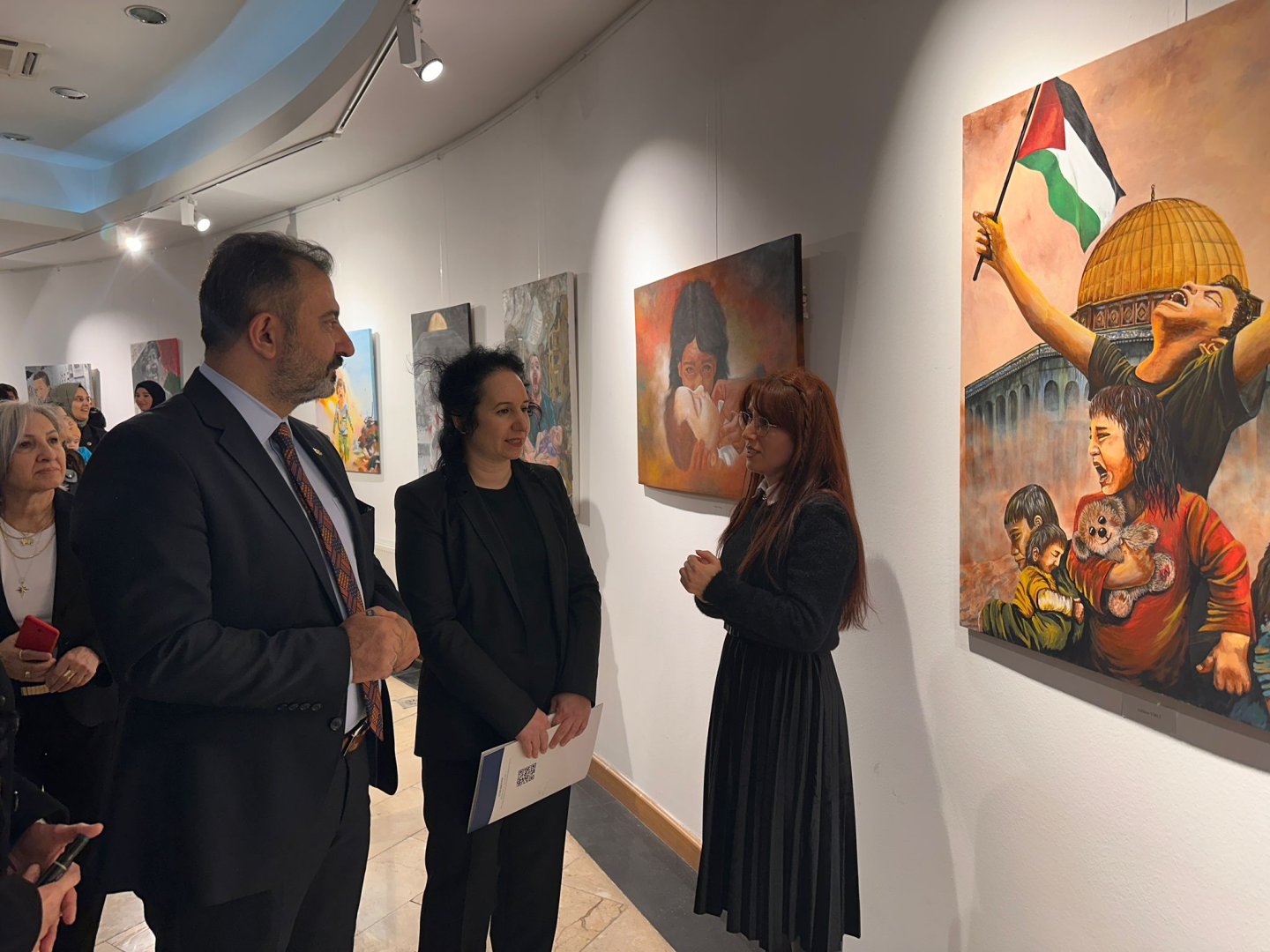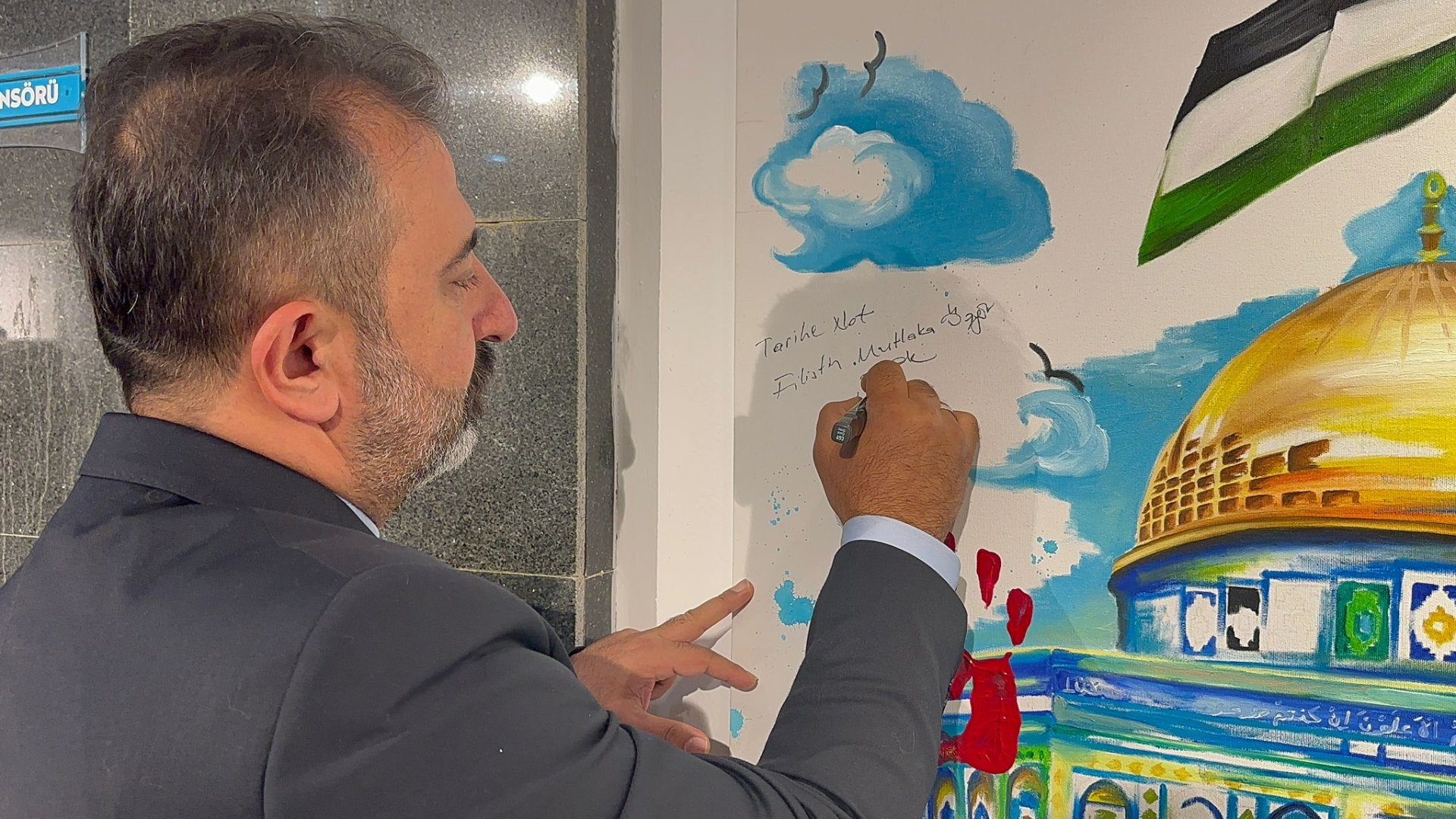 Açılışın ardından, Güzel Sanatlar, Tasarım ve Mimarlık Fakültesi Resim Bölümü Başkanı Doç. Dr. Muteber Burunsuz ile birlikte sergiyi gezen Belediye Başkan Yardımcısı İsmail Yağbat, Mescid-i Aksa resminin yer aldığı tabloya “Tarihe not. Filistin mutlaka özgür olacak” yazarak imzaladı.