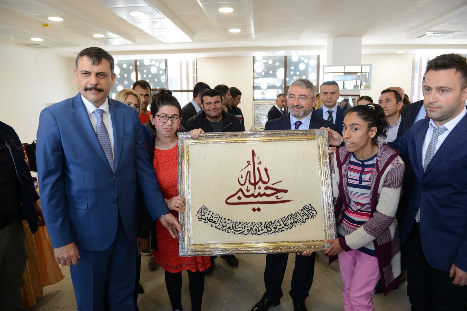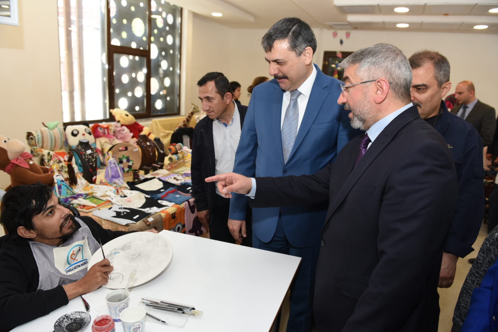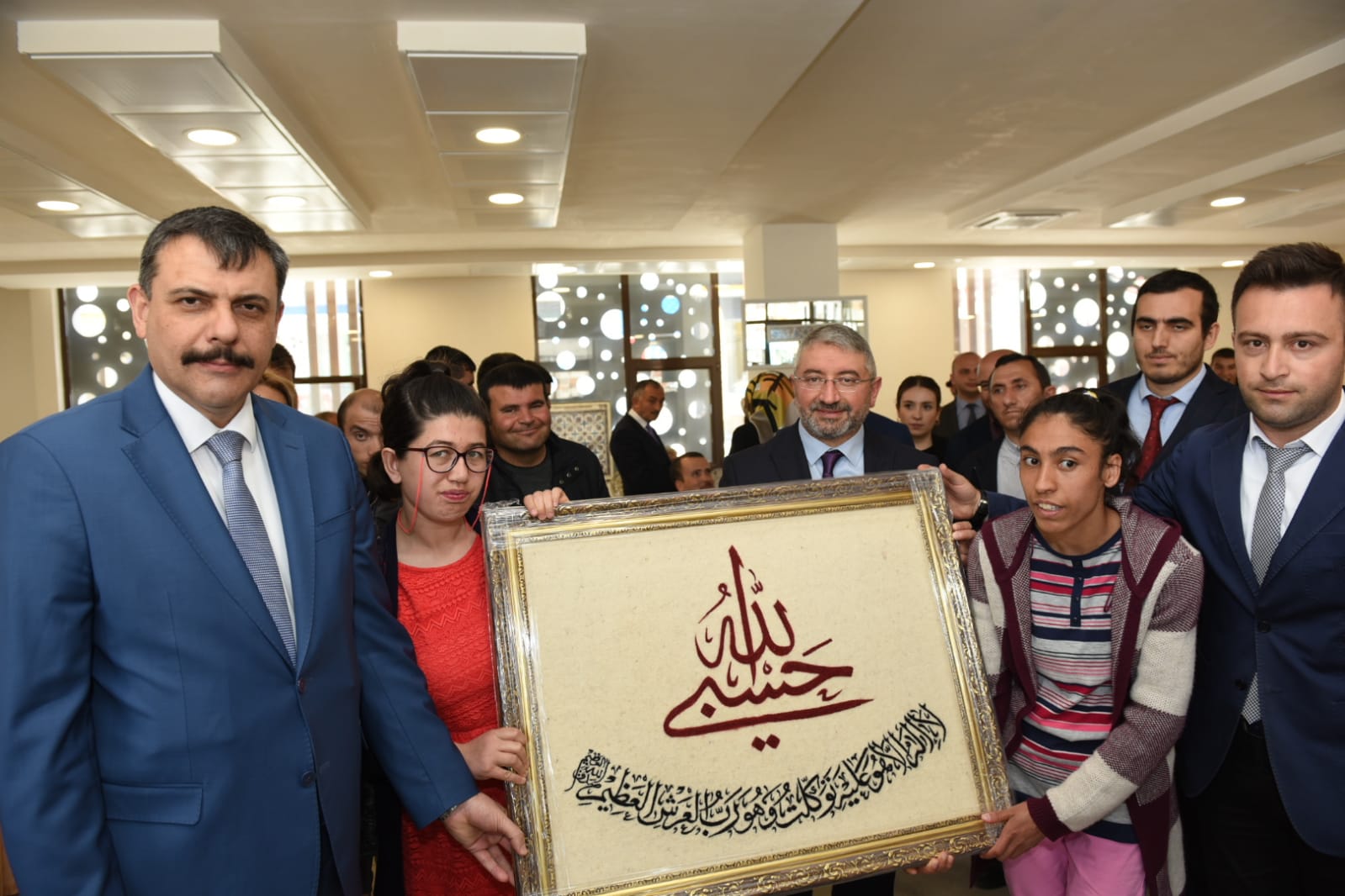 Çorum Belediyesi Engelli Eğitim ve Rehabilitasyon Merkezi öğrencileri, sergide Vali Mustafa Çiftçi’ye keçeden ve dokuma tekniği ile yapılan hediyeyi ettiler.