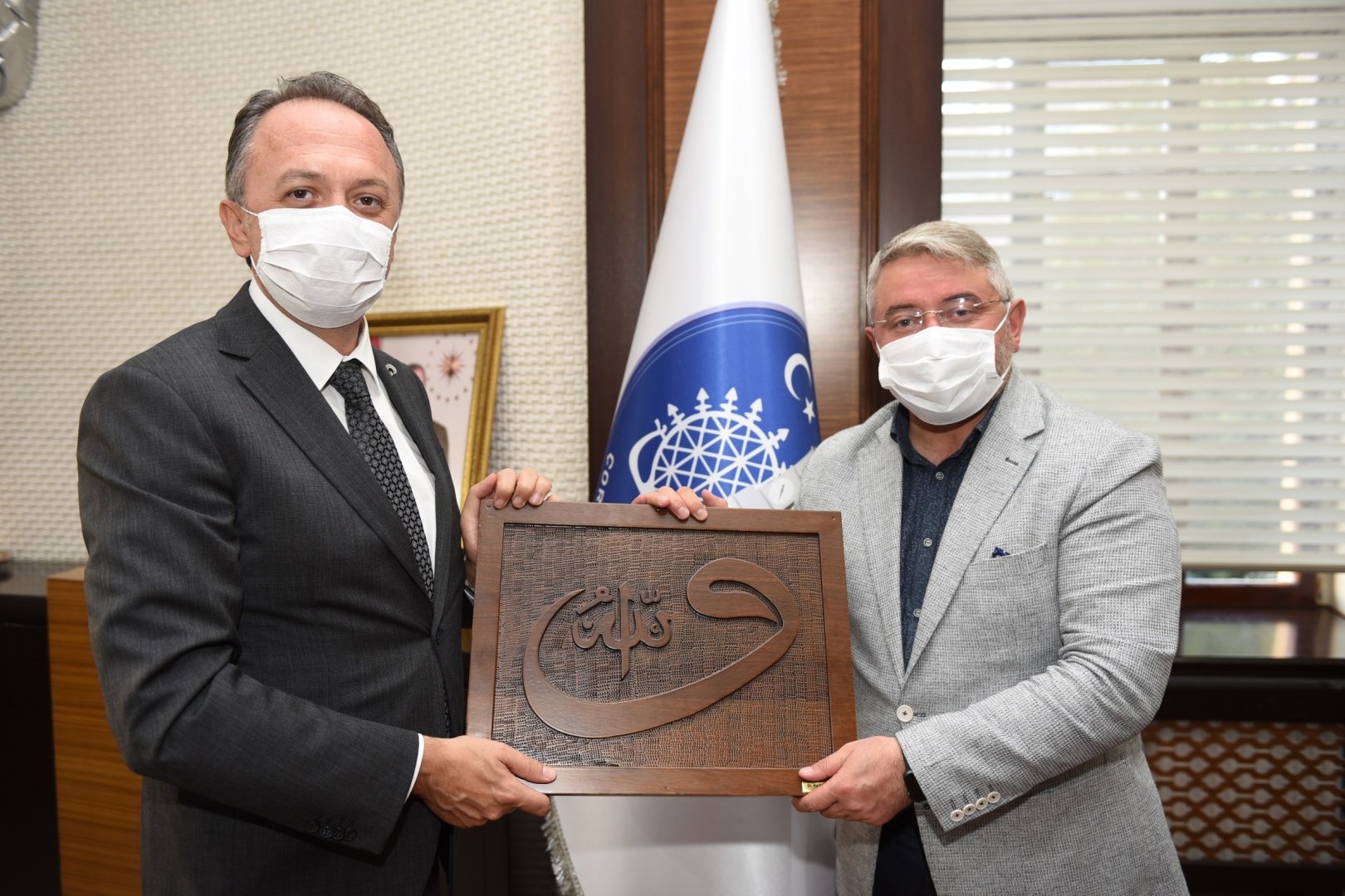 Başkan Aşgın, ziyaret anısına Genel Müdür Gökhan Yazgı’ya el oyması ahşap tablo hediye etti.