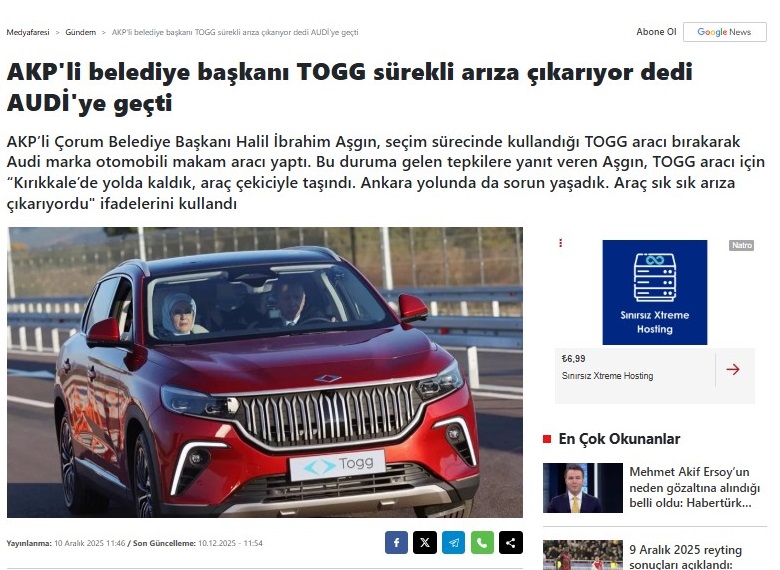 Aşgın’ı ve ülkemizin gururu olan yerli ve milli aracımız TOGG’u hedef alan