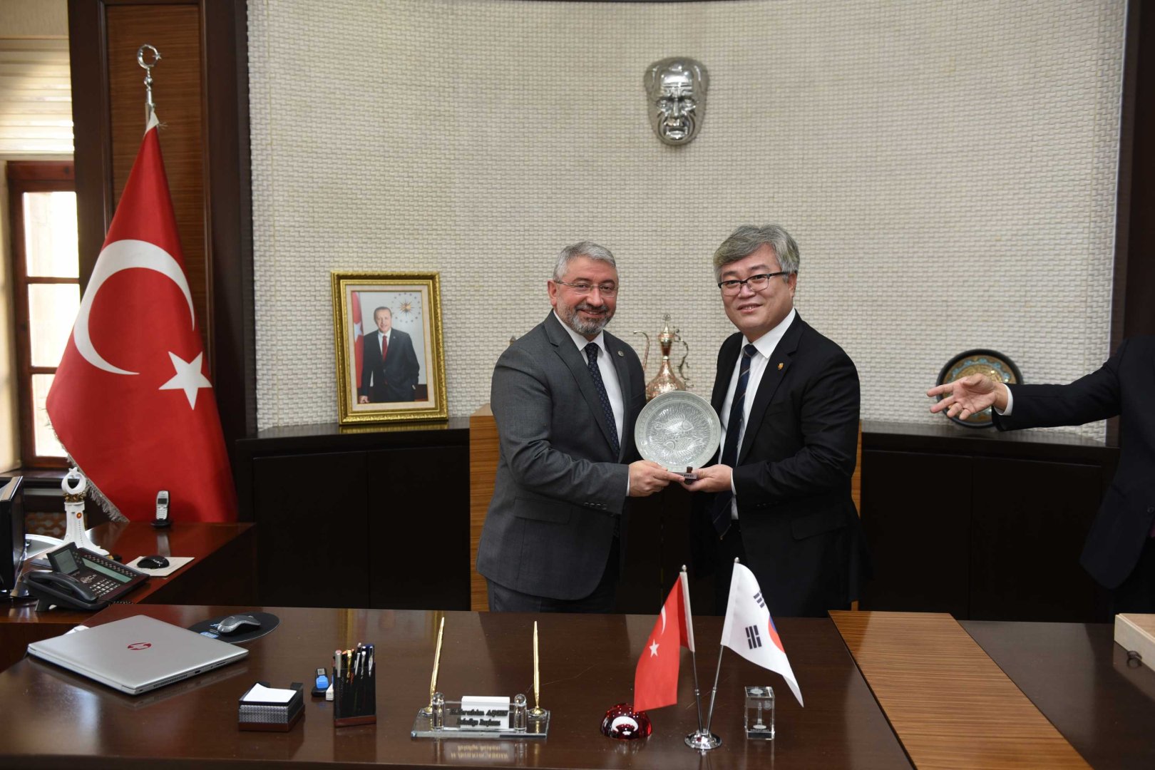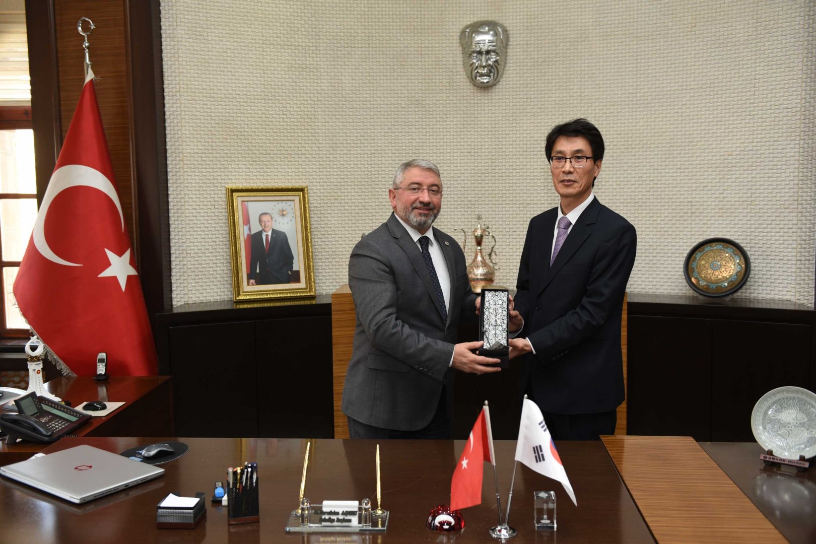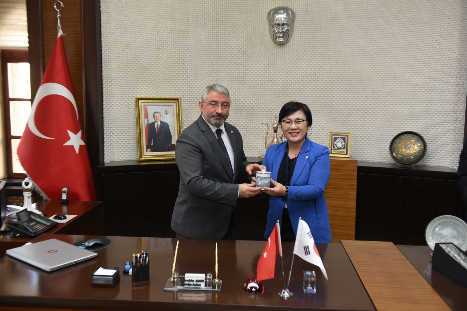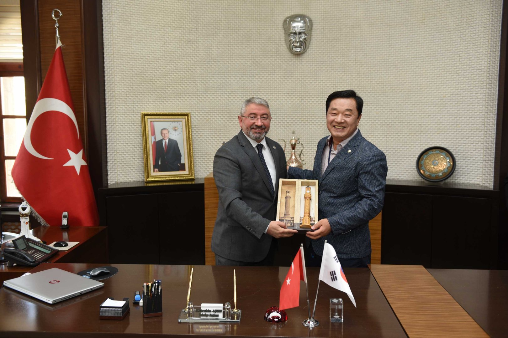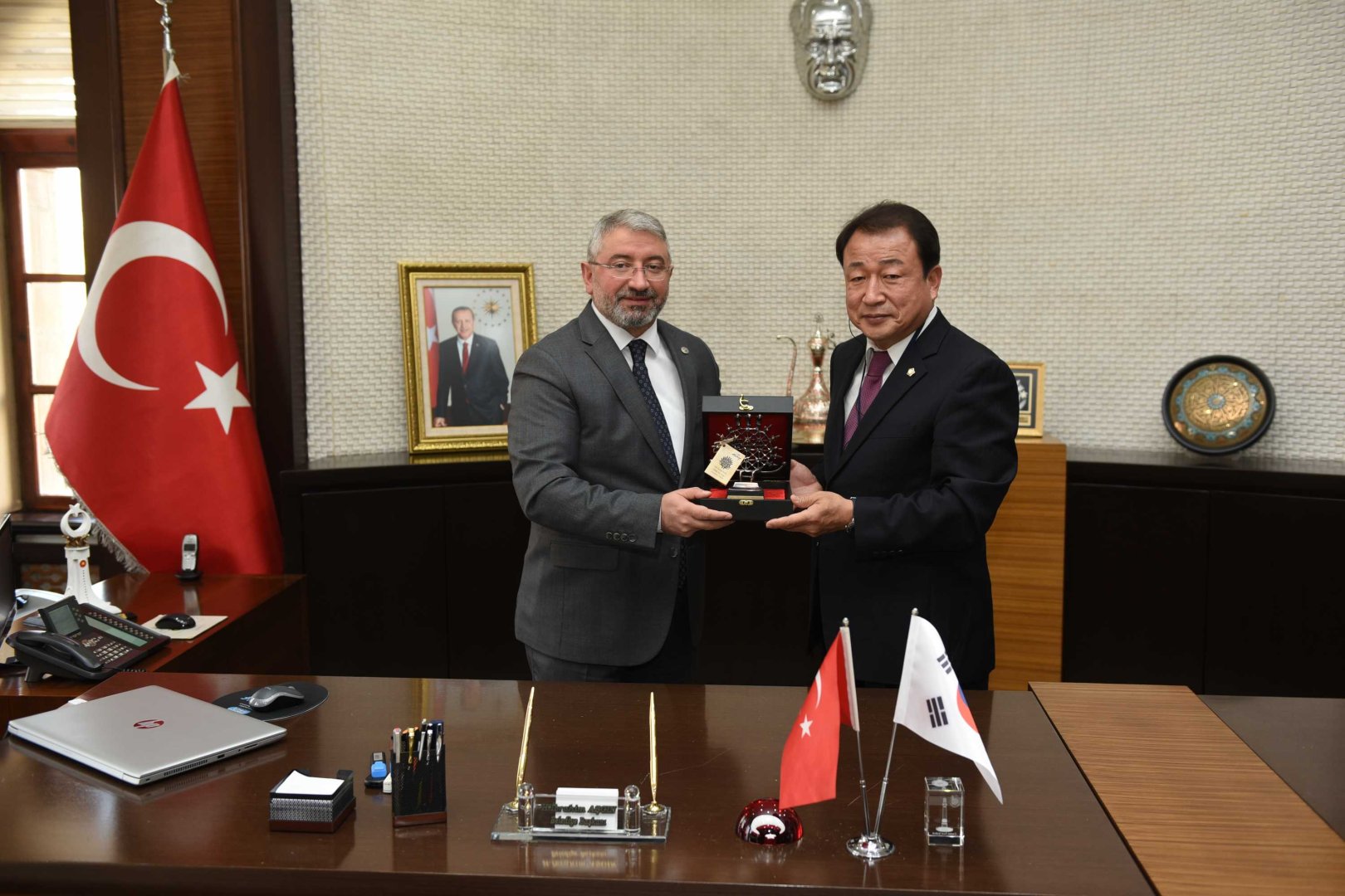 Konuşmaların ardından Belediye Başkanı Dr. Halil İbrahim Aşgın, Gimhae Meclis Başkanı Kim Hyong-su’ya Hitit Güneşi kursu ve Saat Kulesi maketi hediye etti. Heyette bulunanlarda Güney Kore ve Gimhae şehrini temsil eden çeşitli hediyeler verdiler.