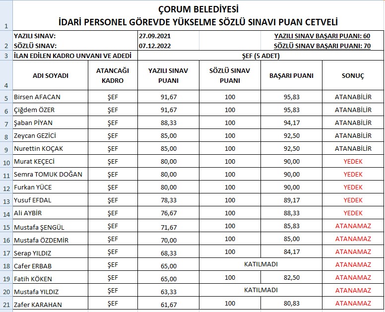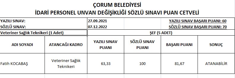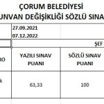 Çorum Belediyesi Personel Görevde Yükselme ve Unvan Değişikliği sözlü sınav sonuçları açıklandı.