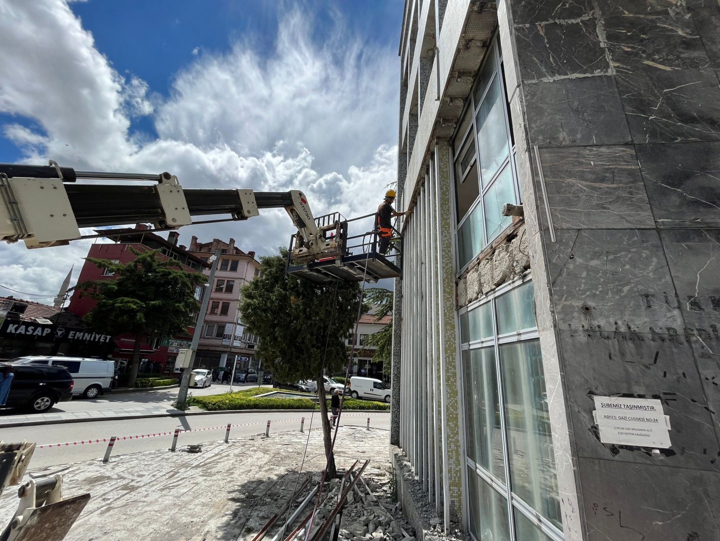 Halkbank’ın yeni yerine taşınarak hizmet binasını tamamen tahliye etmesinin ardından yıkım için gerekli işlemler tamamlandı. Belediyemiz işçileri binanın yıkımından önce tekrardan kullanılabilecek malzemelerin söküm çalışmalarını başlattı.