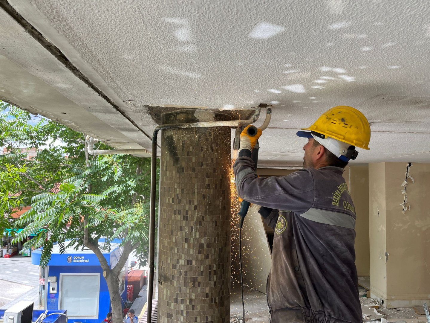 Halkbank’ın yeni yerine taşınarak hizmet binasını tamamen tahliye etmesinin ardından yıkım için gerekli işlemler tamamlandı. Belediye işçileri binanın yıkımından önce tekrardan kullanılabilecek malzemelerin söküm çalışmalarını başlattı.