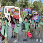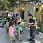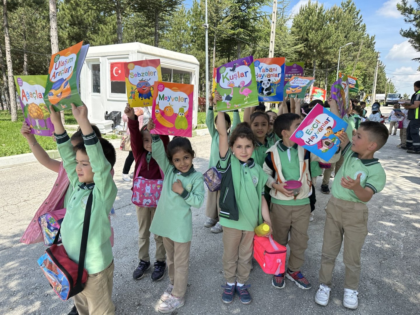 Ziyaretler sırasında Çorum Belediyesi tarafından öğrencilere hayvan figürlü boyama kitapları hediye ediliyor.