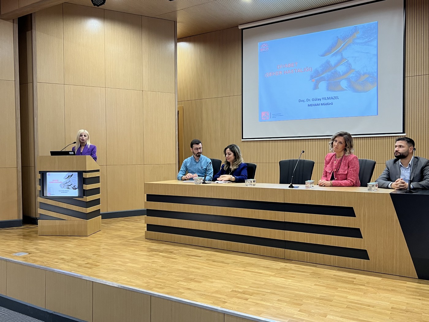 Çorum Belediyesi Toplantı Salonu’nda gerçekleştirilen seminere Belediye Başkan Yardımcısı Lemzi Çöplü’nün yanı sıra belediye personelleri katıldı. Diyabet hastalığının anlatıldığı eğitimde MEHAM üyesi Doç.Dr. Gülay Yılmazel tarafından Tip1 ve Tip 2 diyabette tıbbi beslenme tedavisi, diyabetin sebep olduğu sağlık sorunları ve diyabetten korunmak için dikkat edilmesi gerekenlerle ilgili bilgilendirmeler yapıldı. Yılmazel Diyabetin, pankreastan salgılanan insülin hormonunun az veya etkisiz olmasından kaynaklanarak tüketilen yiyeceklerdeki glukozun hücre içerisine giremeyip kanda birikmesiyle açıklanabilen kronik bir hastalık olduğunu ifade etti. Diyabet hastalığının belirtilerinden bahseden Doç. Dr. Gülay Yılmazel belirtilerin başlaması ile birlikte mutlaka hastaneye başvurulması gerektiğinin altını çizdi.