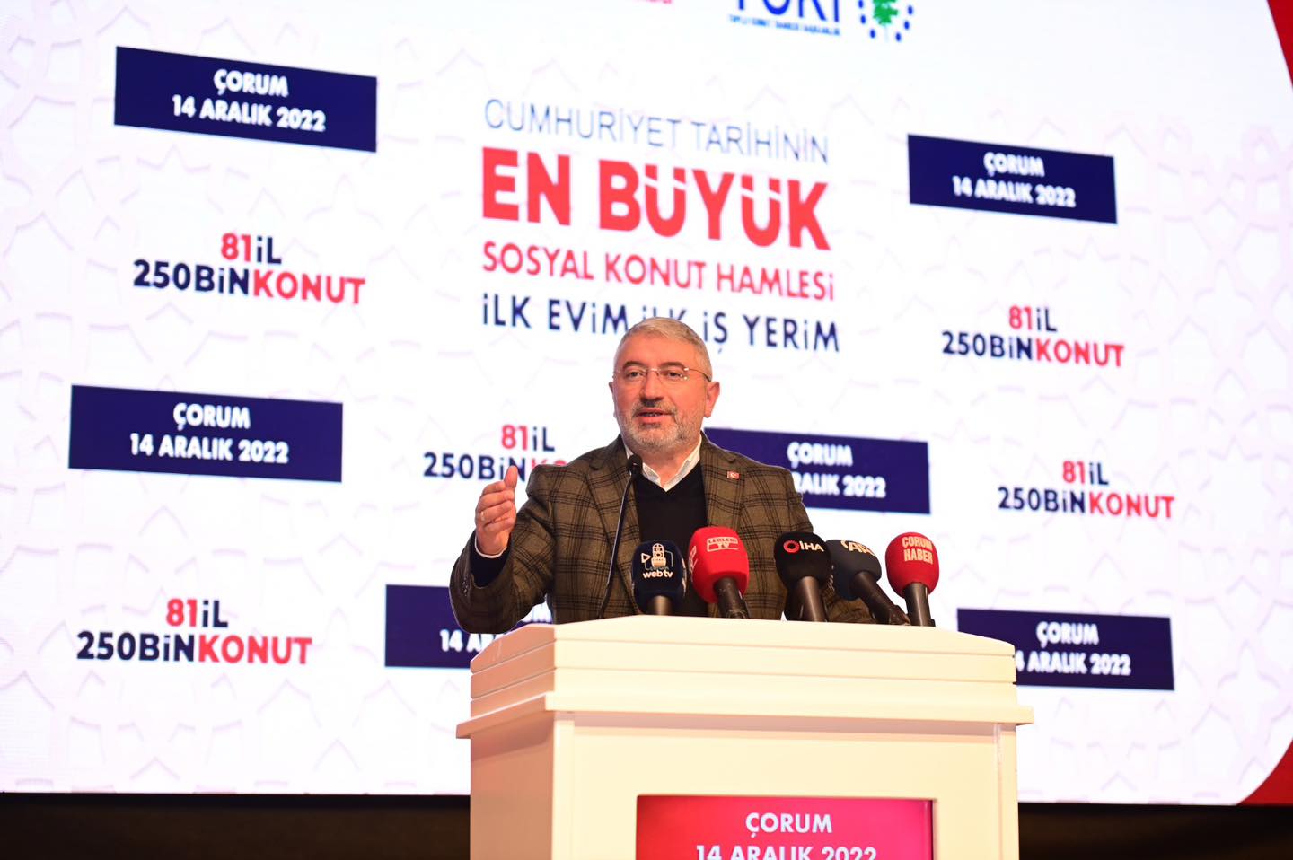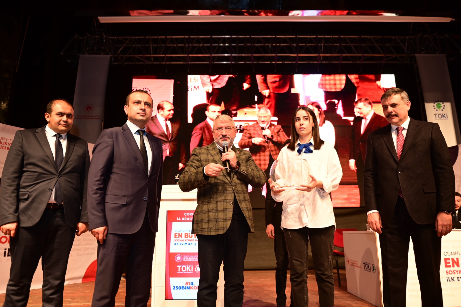 Kura çekim töreninde konuşan Belediye Başkanı Dr. Halil İbrahim Aşgın, proje kapsamında Türkiye genelinde neredeyse Çorum’un merkez nüfusu kadar konut inşa edileceğine dikkati çekti. Türkiye’nin en büyük sosyal konut hamlesinin hayata geçirildiğini vurgulayan Aşgın, “Bu kadar güzellik, bu kadar milletine düşkünlük, bu kadar yapılan icraat ancak aşkla çalışarak yapılır. Biz Çorum için aşkla çalışıyoruz, büyüklerimiz Ankara’da bütün mazlumlar için aşkla çalışıyor. Allah onlardan razı olsun.” diye konuştu.