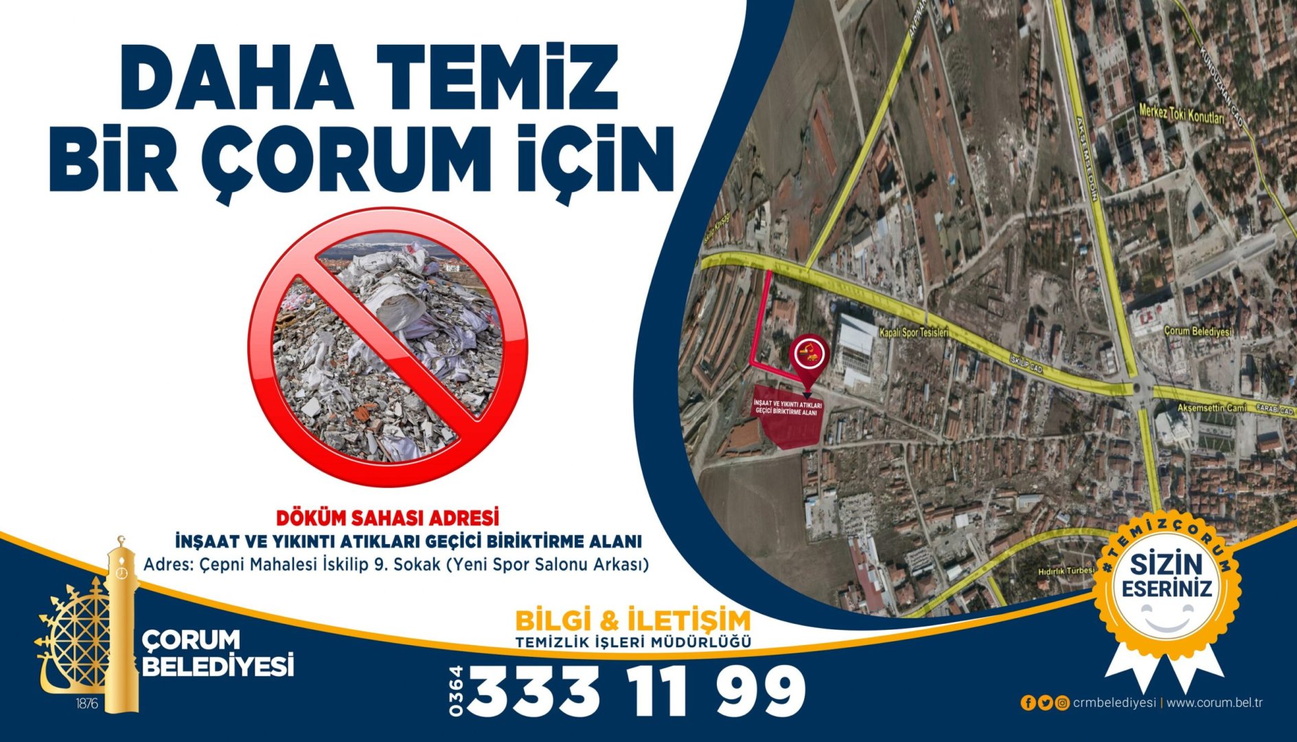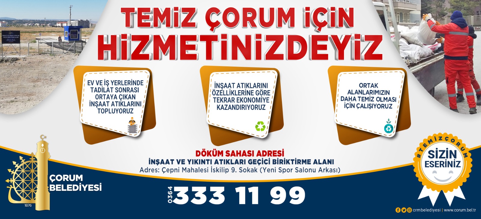 Çevre konusunda hassas bir hizmet politikası izlediklerini ifade eden Belediye Başkan Yardımcısı İsmail Yağbat, “İskilip Caddesinde Yeni Spor Salonu inşaatın arka kısmında bulunan 15 dönümlük araziye ‘İnşaat ve Yıkıntı Atıkları Geçici Biriktirme Alanı’ oluşturduk. Alanın etrafını tel örgü ile çevirdik. Gelen atıkların tartımı için 60 tonluk kantar oluşturduk. Bu alan sayesinde ev ve iş yerlerinde tadilat yapan vatandaşlar atıklarını getirebilecek bir yer oluşturduk. Atıklarını getiremeyen vatandaşlar belediyemizi aradığında yine ekiplerimiz giderek evlerinden bu atıkları teslim alıyor.” dedi.