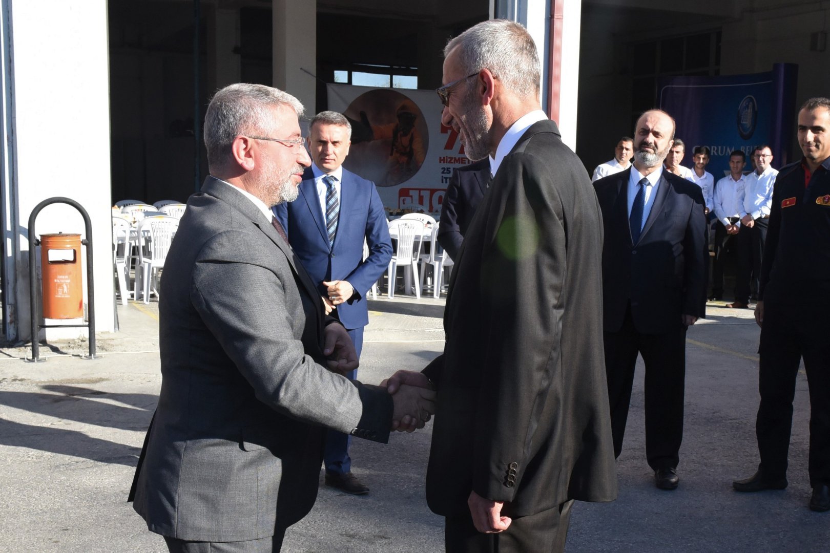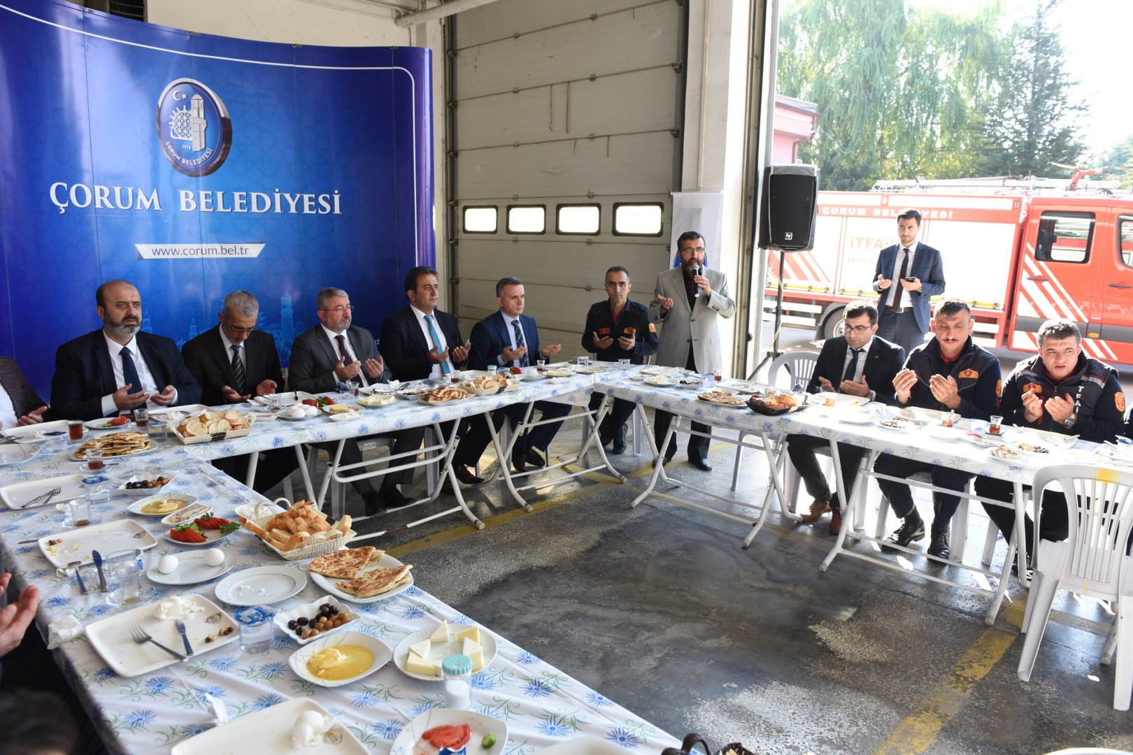 Osmanlı’da itfaiyeye çok güzel bir isim konmuş. Ben ecdadımla bir kez daha gurur duydum. Dergâh-ı Âli Tulumbacı Ocağı 1719’da kurulmuş. “Dergâh-ı Âli” yüce dergah demek. O zamanlar itfaiye teşkilatı yüce olarak görülmüş. Bizler de ecdadımızın izindeyiz sizleri onların gördüğü gibi görüyoruz. 305 yıllık bir teşkilat itfaiye teşkilatı. 1714’ten bugüne kadar Allah için bu teşkilata hizmet etmiş tüm ecdadımızdan, kardeşlerimizden razı olsun, Allah onların mekanlarını cennet etsin. 1923 yılında Cumhuriyet kurulmuş, 2 yıl sonra hemen itfaiye müdürlüğü kurulmaya başlanmış. Erzincan, Trabzon ve Çorum’da da hemen kurulmuş. Çorum cumhuriyet döneminde İtfaiye teşkilatının kurulması noktasında erken davranan yerlerden bir tanesi. Bunun sonuçları olarak da gelişmiş bir araç filomuz var. Eğer ihtiyaç olursa da yenilerini de alırız. Söylediğim gibi sizler saniyelerle yarışıyorsunuz. Çorum itfaiyesiyle biz gurur duyuyoruz. Ben fotoğraflara bakarken, ürktüğüm fotoğrafların içerisinde sizler varsınız. Cesaretle, büyük bir ferasetle, aşkla mücadele ediyorsunuz. Ateşin, korun içerisine cesaretle, metanetle dalıyorsunuz. Allah sizden razı olsun. Bu zamana kadar olduğu gibi bundan sonra da alt üst ilişkisini bir kenara bırakarak, her zaman yanınızdayız. Mesleğinizle, işinizle, teşkilatınızla olan sorunlarınızla ilgili, özel hayatınızla ilgili sorun olursa onlarla ilgili her zaman kapımız açık. Tekrar haftanızı tebrik ediyor, çalışmalarınızda başarılar diliyorum” ifadelerini kullandı.