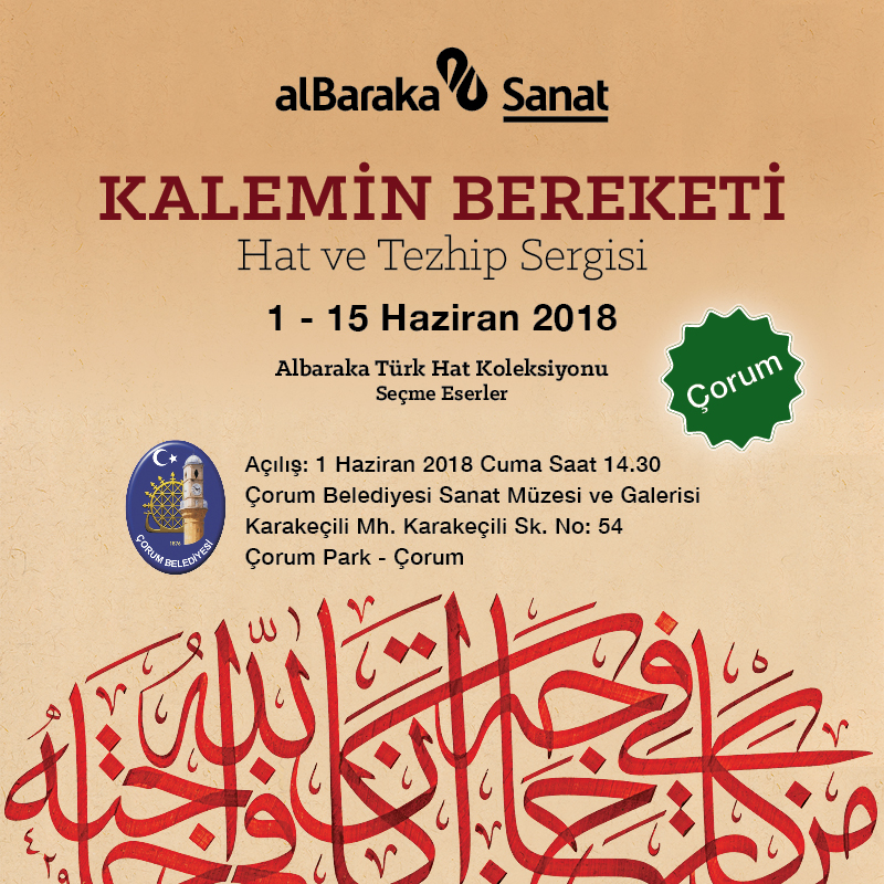 Anadolu şehirlerini gezerek ülke çapında tüm sanatseverlere ulaşmayı hedefleyen Kalemin Bereketi Hat ve Tezhip Sergisi 1 Haziran 2018 Cuma günü Saat:14.30’da Çorum Belediyesi Sanat Galerisi’nde açılışı gerçekleşecek. Albaraka Türk’ün hat ve tezhip koleksiyonunun seçkin eserlerinden oluşan sergi 1-15 Haziran 2018 tarihleri arasında açık kalacak sergi de 60 adet seçme eser sergilenecek.