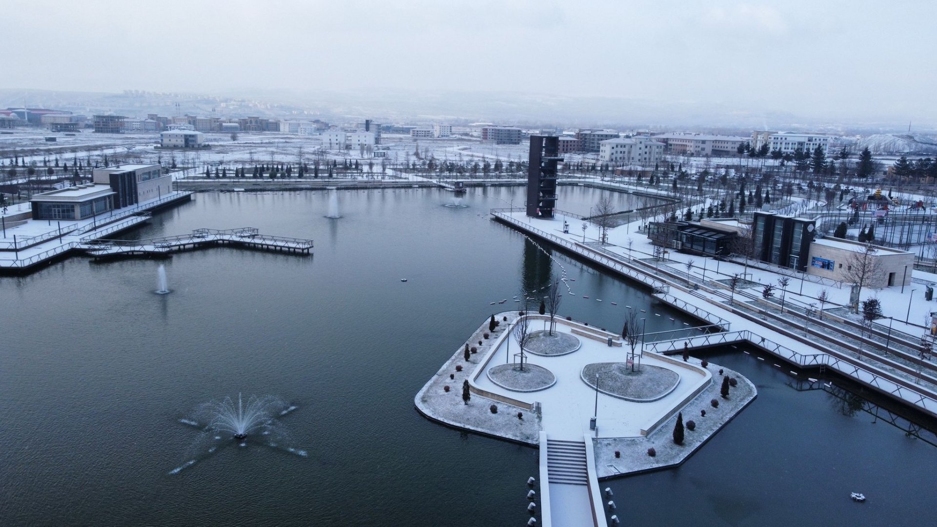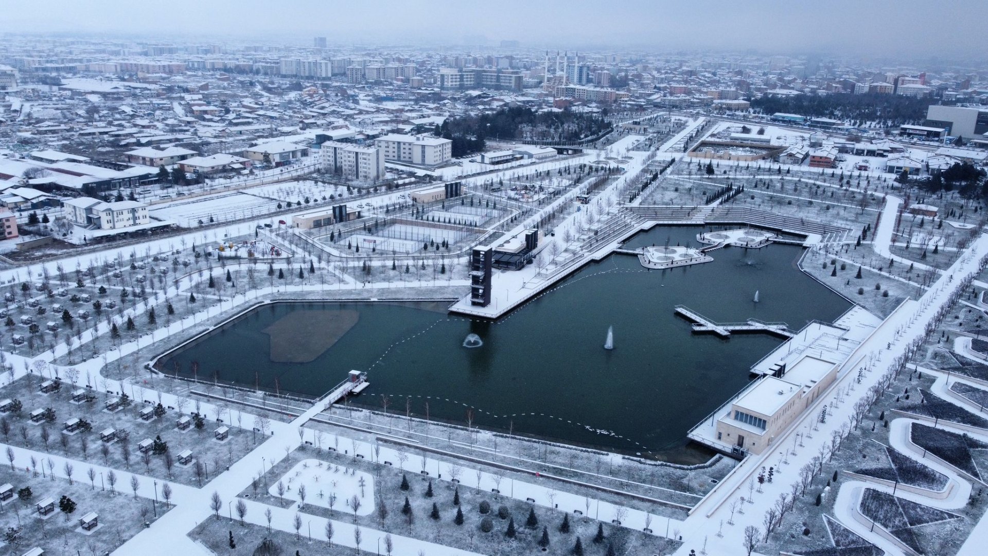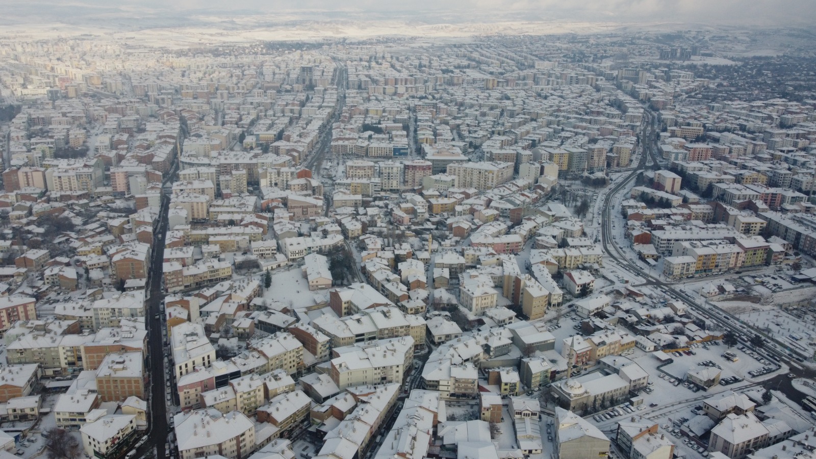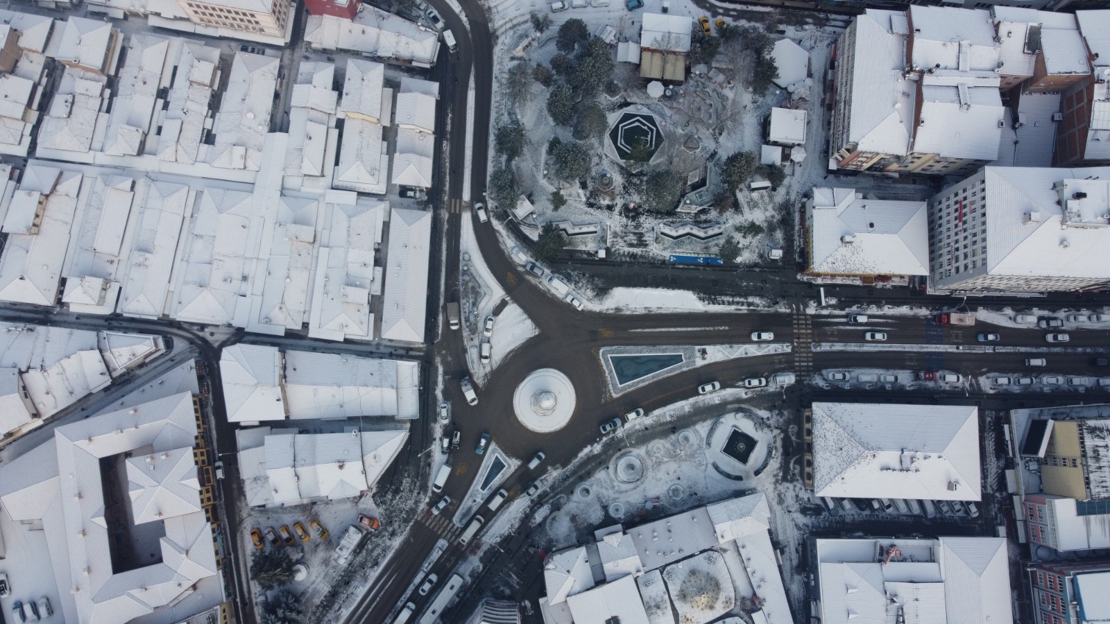 Havadan görüntülenen karla kaplı mekânların görüntüsü görenleri adeta büyüledi.