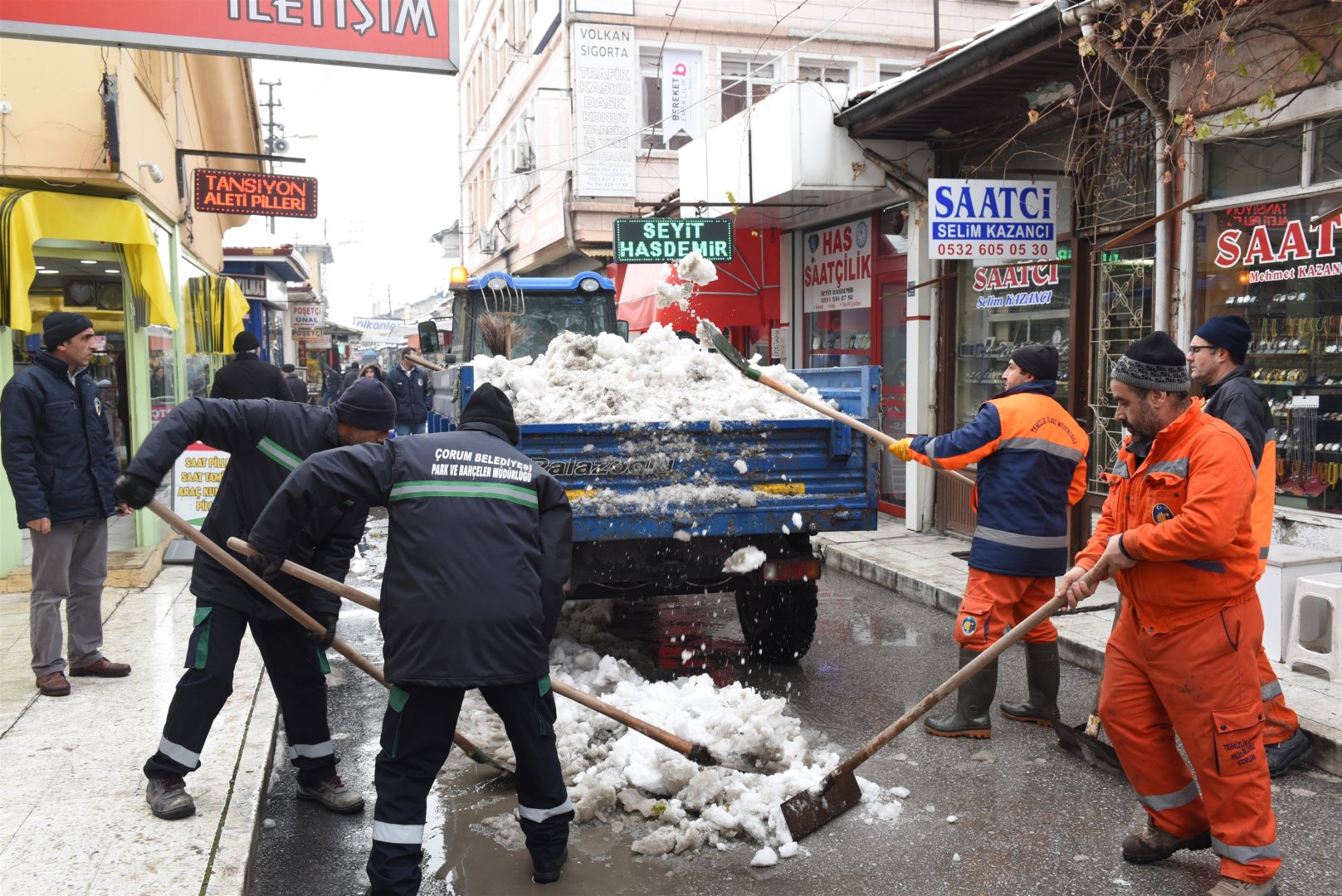 Çorum Belediyesi hem araçların hem de yayaların ulaşım sorunu yaşamaması için gece gündüz çalışıyor.