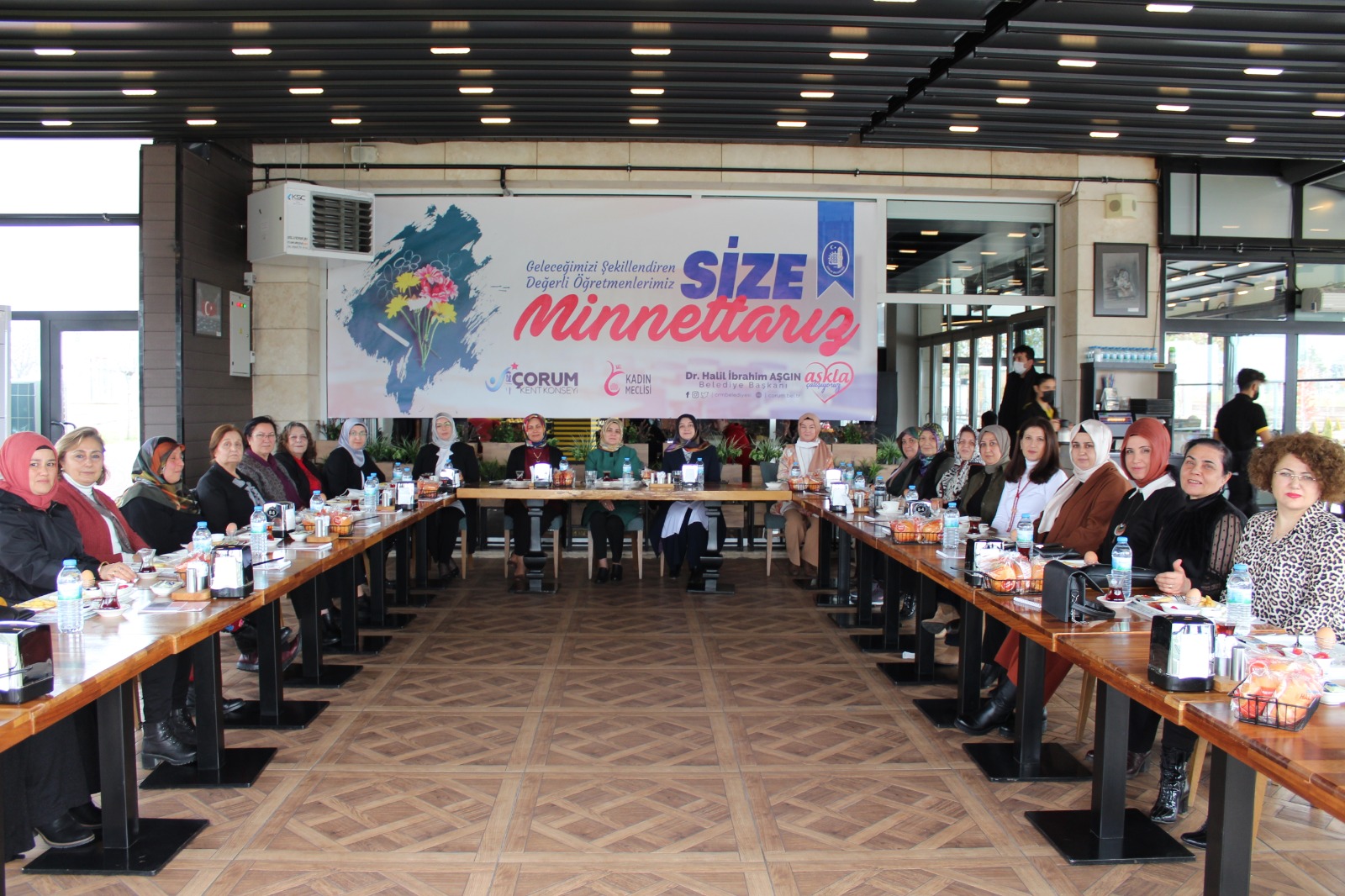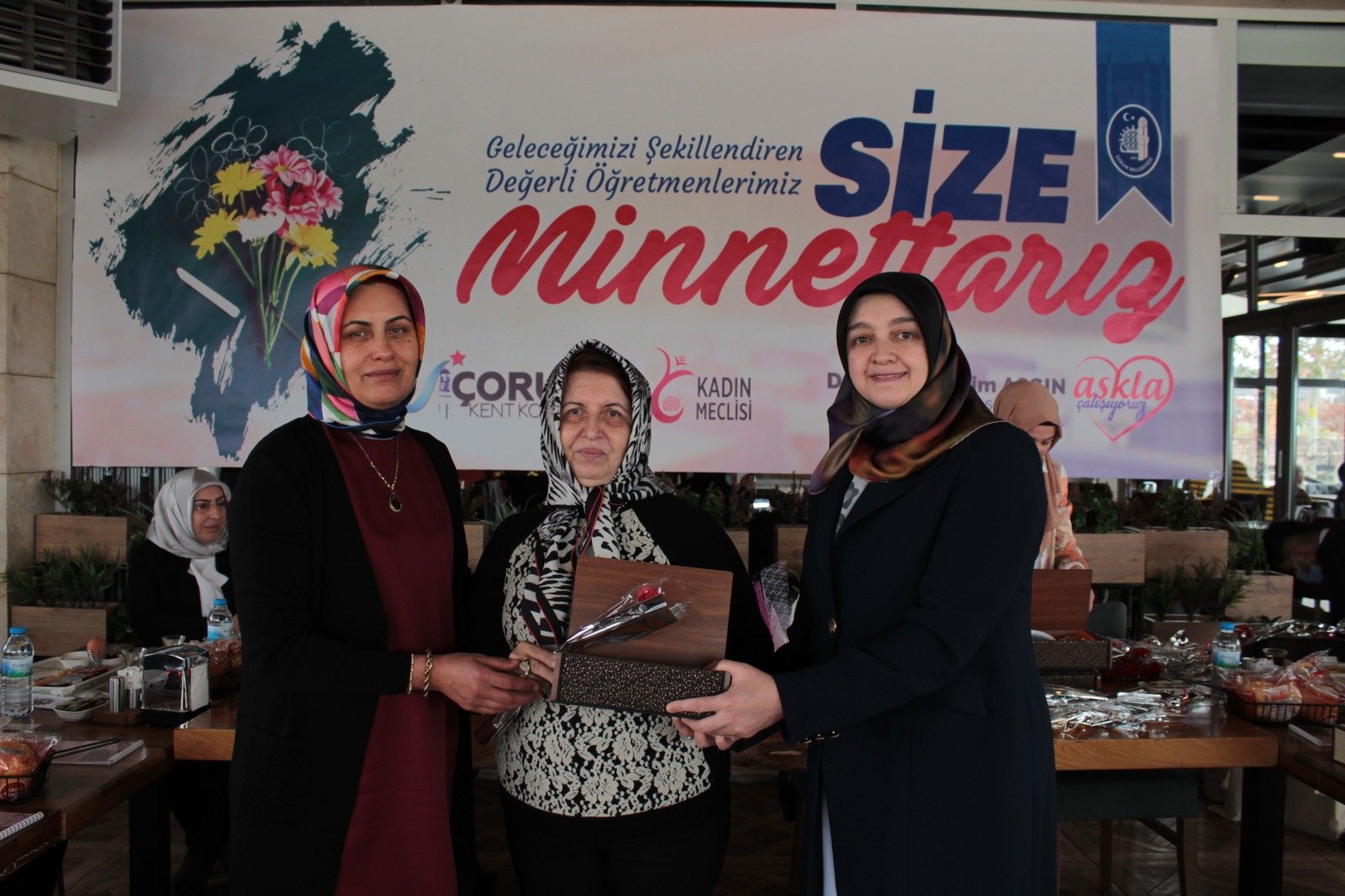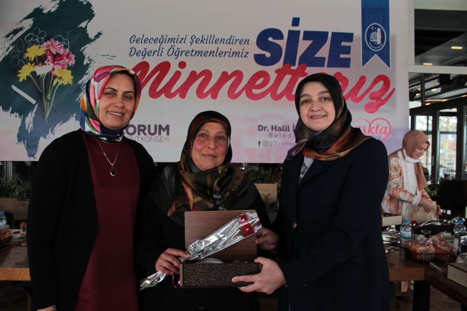 Çorum Valisi Mustafa Çiftçi’nin eşi Azime Çiftçi, Belediye Başkanımız Dr. Halil İbrahim Aşgın’ıneşi Feyza Aşgın, Kadın Meclisi Başkanı Ayşe Yaz, Belediye Başkan Yardımcılarının eşleri, Kadın Kültür Merkezlerinde görevli öğretmenler ve emekli öğretmenlerin katıldığı programda öğretmenlere hediyeler takdim edildi.