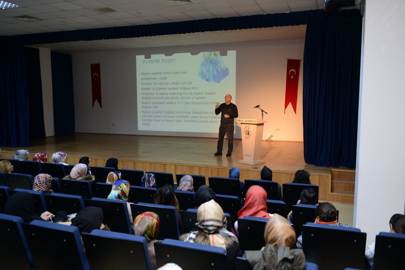 Poşetlerin ücretli olmasının poşet kullanımını azaltacağını, bununda doğa ve insana büyük bir fayda sağlayacağını ifade eden Hitit Üniversitesi Fen Edebiyat Fakültesi Öğretim Üyesi Prof. Dr. Dursun Ali Köse, workshop ve sergi öncesinde kadınlara kısa bir sunum yaptı. Köse, poşetin doğada kaybolmayan bir maddeden elde edildiğini ve insanın kullandığı poşetin sadece onda birini doğadan geri toplayabildiğini söyledi. Prof. Dr. Köse, “Poşetleri amacına uygun kullanmamız gerekir. Marketten fazlaca poşet almak ve o poşetleri çöp poşeti niyetine kullanmak amacı dışında bir kullanım oluyor ve doğaya fazladan yere poşet atılması sorunu ortaya çıkıyor. Bilinçli olmamız lazım ve bu şekilde amacı dışında kullanımlara mahal vermemiz gerek. Bu sebepten, 01.01.2019 tarihinde geçeceğimiz ücretli poşet uygulaması güzel bir uygulama olacak” diye konuştu.