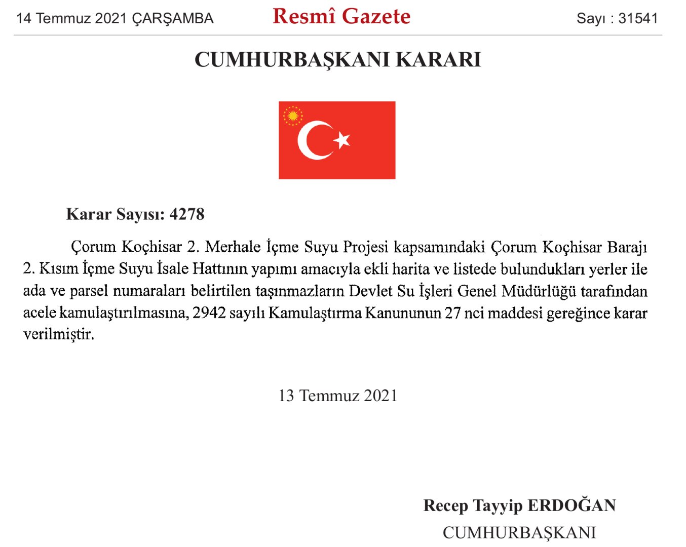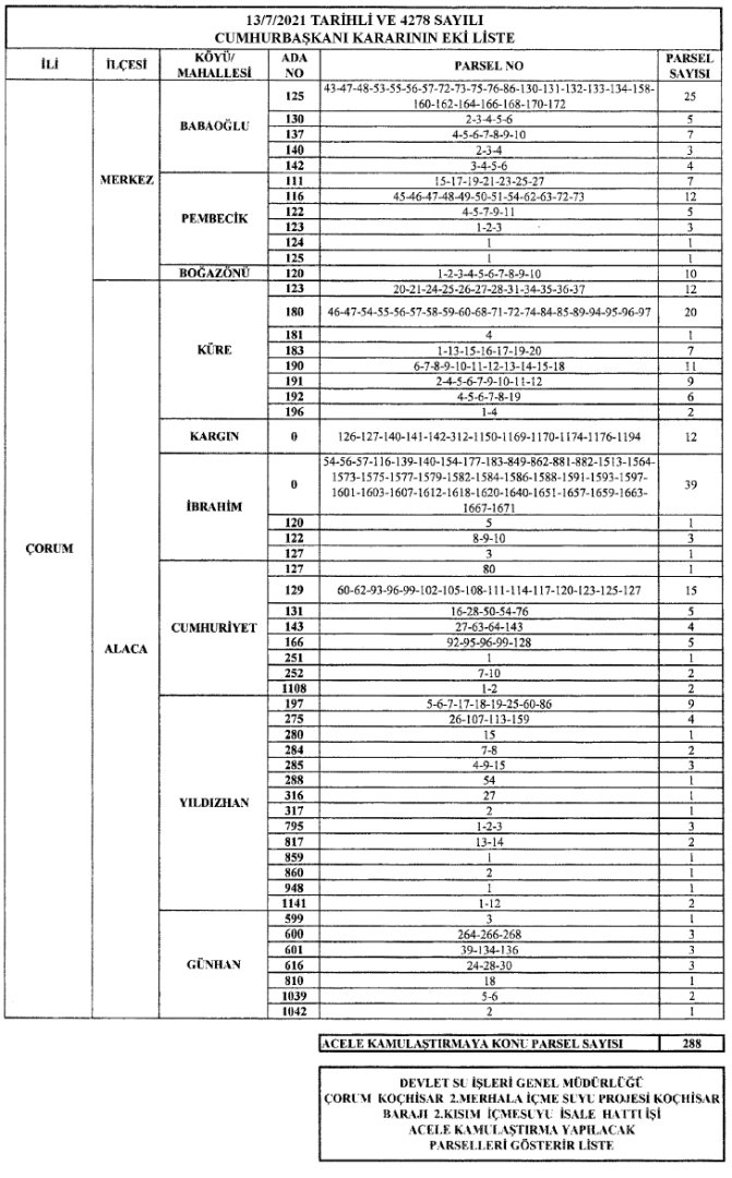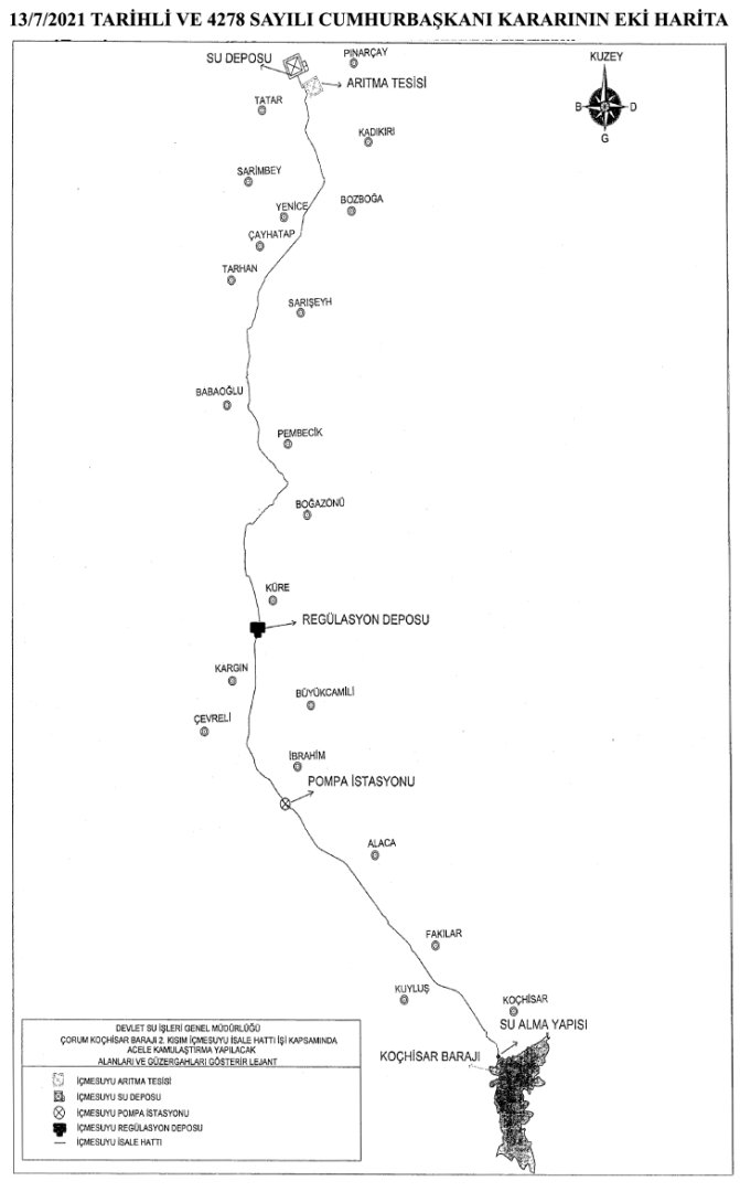 Çorum’un 10 yıllara sari içme suyu problemini ortadan kaldıracak olan Koçhisar İsale Hattı Projesine Cumhurbaşkanlığı kararıyla acil kamulaştırma çıktı.