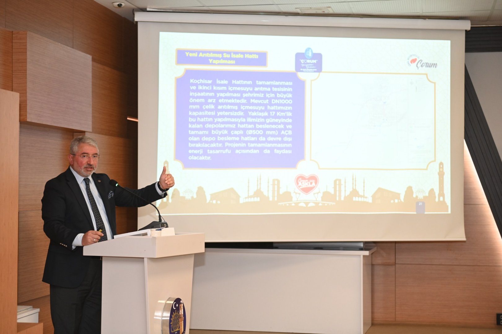 Başkan Aşgın “Geçen yıl bu zamanlar şehrimizin en önemli problemi içme suyu sorunuydu. İçme suyumuz hiç kalmadı dediğimiz günlerde Cumhurbaşkanımızın da öncülüğünde Bakanlığımız ve DSİ'nin olağanüstü çalışma ve gayretleriyle Alaca Koçhisar'dan 53 kilometreden rekor denebilecek bir sürede su sorununun çözülmüş olması, hem de 2055’e kadar çözülmüş olması gerçekten büyük bir teşekkürü hak ediyor ve emeği geçen DSİ’nin bütün yetkililer de ben kalbi şükranlarımı teşekkürlerimi sunuyorum. Bizde Çorum Belediyesi olarak bütün mesai arkadaşlarımızla beraber her türlü desteği açıkçası verdik. Rabbimize hamdolsun ki 2055’e kadar hiçbir sorunumuzun olmadığı ifade edildi. Bu bağlamda şehrimiz adına emeği geçen herkese kalbi şükranlarımı, teşekkürlerimi sunuyorum.” dedi.