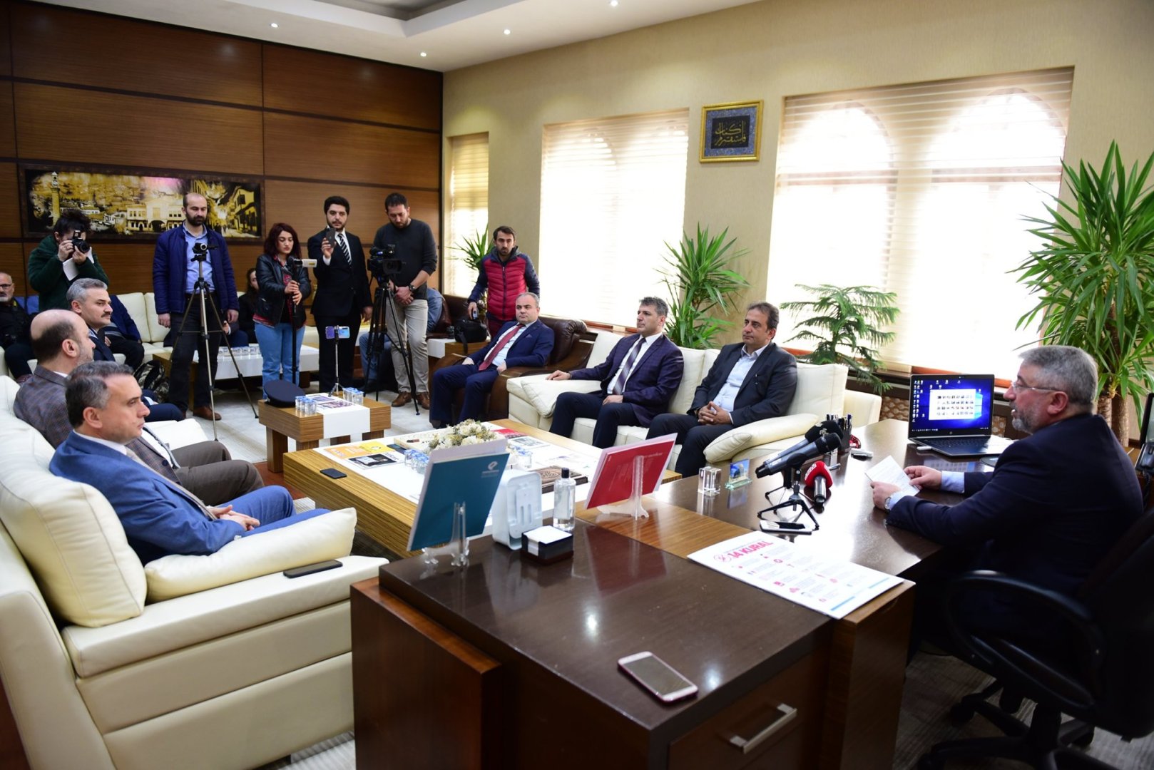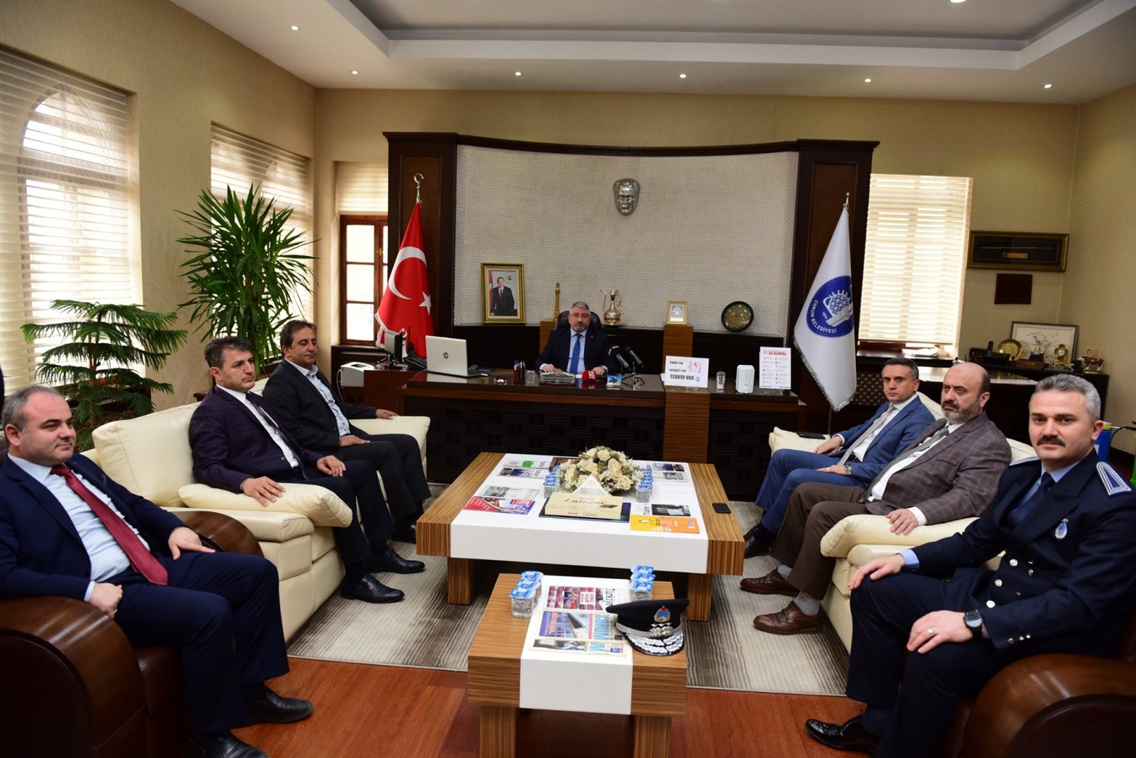 Başkanlık makamında yapılan toplantıda Belediye Başkan Yardımcılarımız İsmail Yağbat, Lemzi Çöplü, Zübeyir Tuncel, Alper Zahir,Turhan Candan ve Zabıta Müdürümüz Fatih Sak hazır bulundu.
