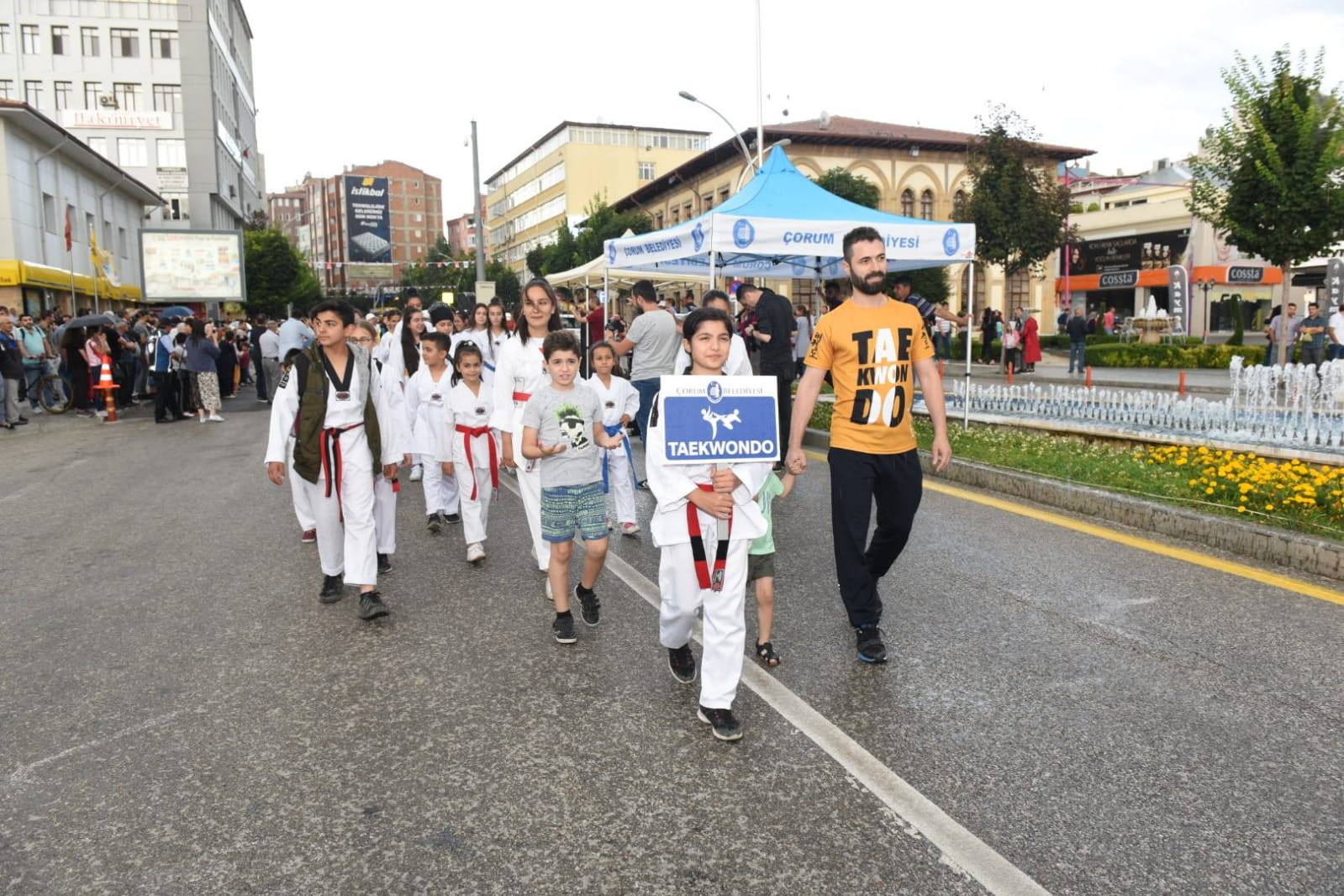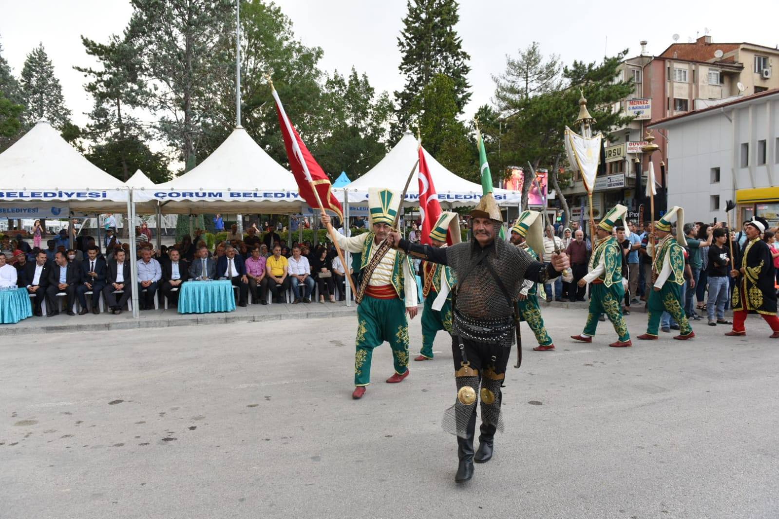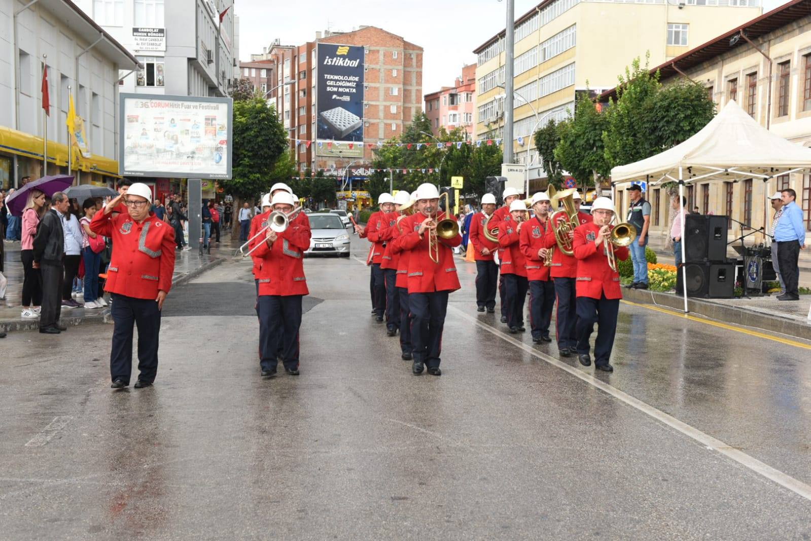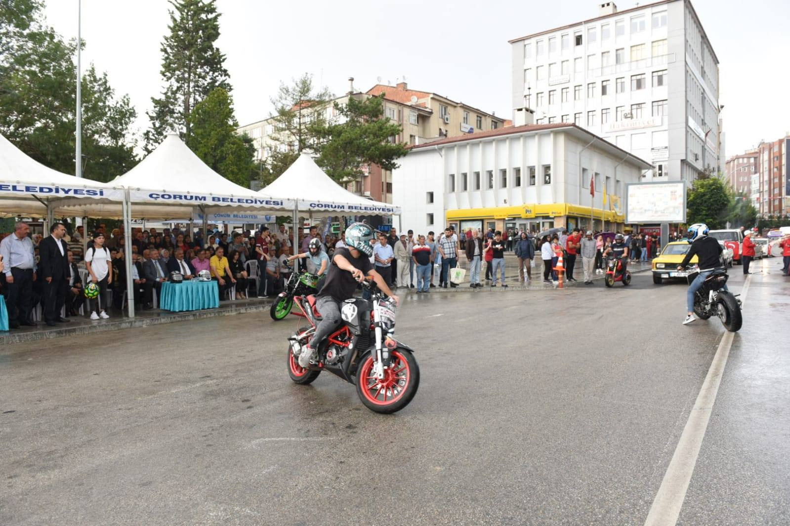 Saygı Duruşu ve İstiklal Marşı’nın okunması ile başlayan program Çorum Belediyesi Mehter Takımı’nın gösterisi ile devam etti. Yağışın da etkisiyle kısa süren gösterinin ardından kortej geçişine geçildi. Renkli görüntülerin oluştuğu kortej geçişinde Halk Dansları etkileri, Çorum Belediyesi Spor Kulüpleri ile sanayi ve esnaf odalarının ekipleri selamlama gösterisi yaptı. Kortej geçişinde en büyük ilgiyi motorcular gördü. Motorcular yaptıkları akrobasi gösterisi ile büyük alkış topladı. Motosiklet ile adeta dans eden motorcular, motorun üzerinde tek ayak gösterisi ile yürekleri hoplattı. Motorcuların gösterisinin ÇESOB Başkanı Recep Gür ve esnaf oda başkanları halkı selamladı. ÇESOB Başkanı Recep Gür, Belediye Başkanı Halil İbrahim Aşgın’a çiçek takdim ederken, Çorum Oto Tamirciler Odası Başkanı Necmettin Uzun da kask hediye etti. Tören Çorum Belediyesi Bando Takımı’nın kortej geçişi ile sona erdi.