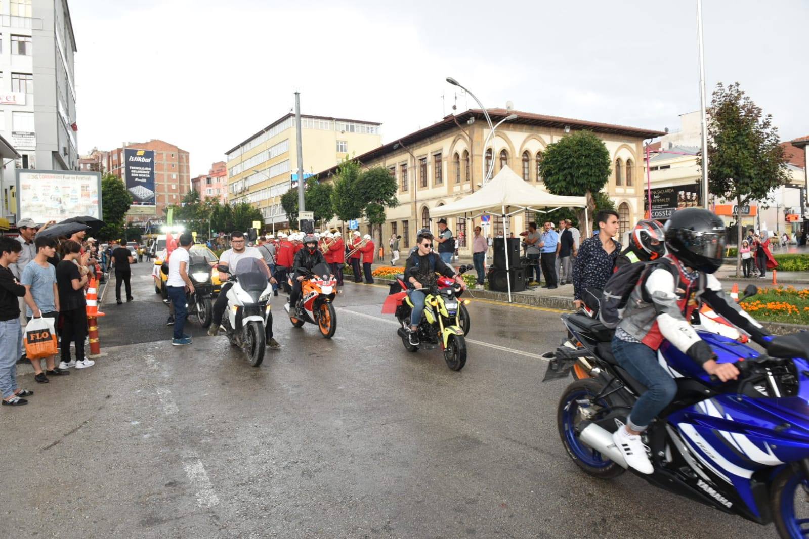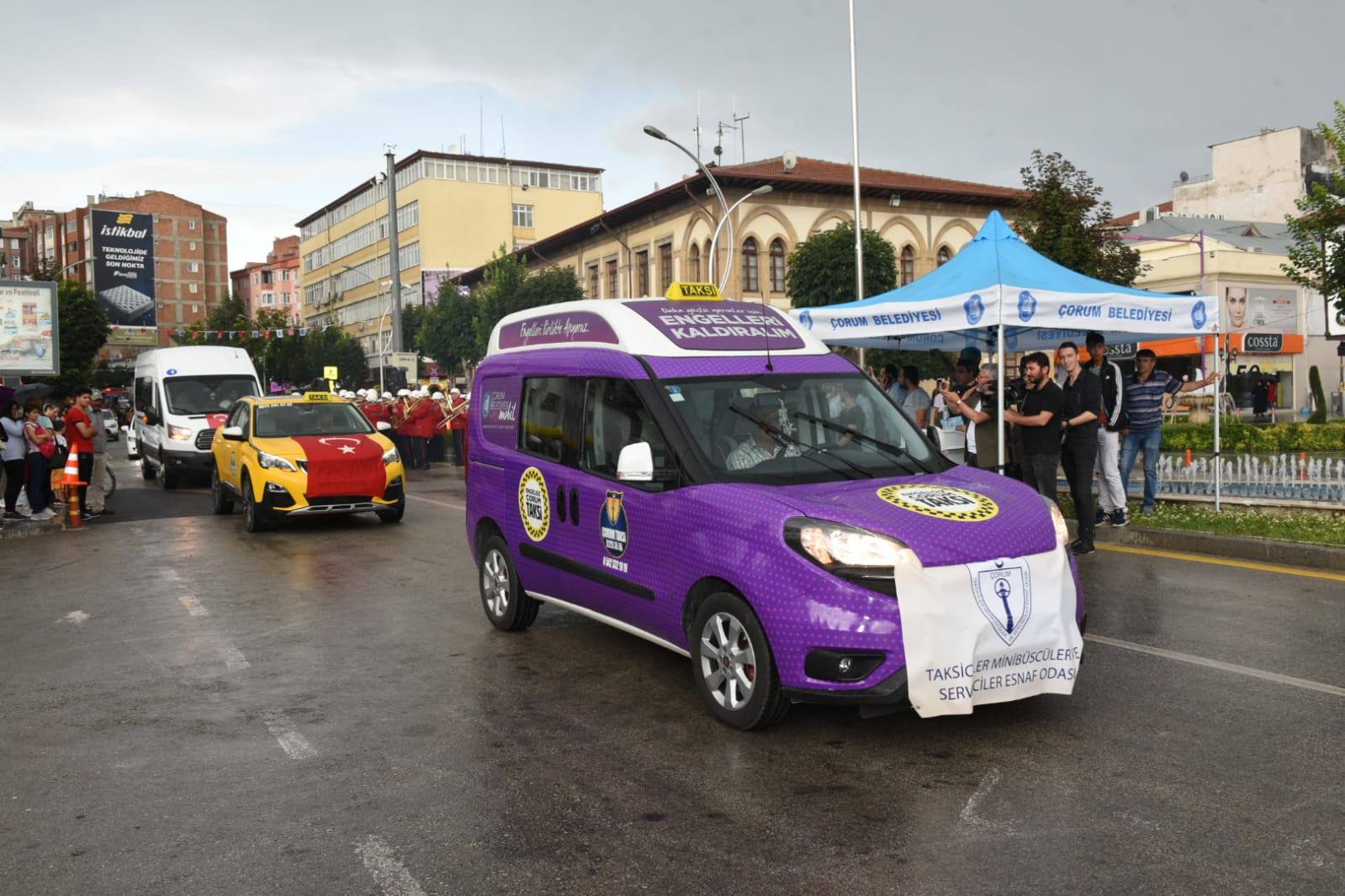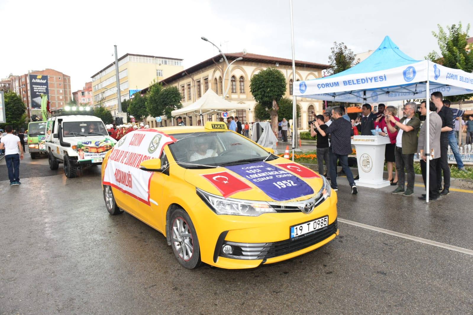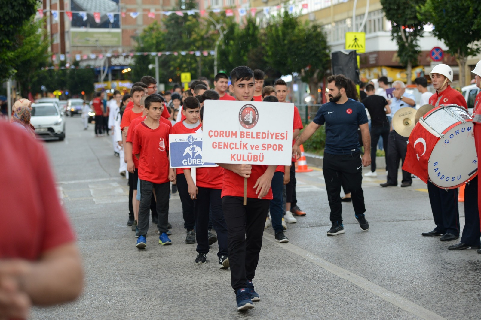 Saygı Duruşu ve İstiklal Marşı’nın okunması ile başlayan program Çorum Belediyesi Mehter Takımı’nın gösterisi ile devam etti. Yağışın da etkisiyle kısa süren gösterinin ardından kortej geçişine geçildi. Renkli görüntülerin oluştuğu kortej geçişinde Halk Dansları etkileri, Çorum Belediyesi Spor Kulüpleri ile sanayi ve esnaf odalarının ekipleri selamlama gösterisi yaptı. Kortej geçişinde en büyük ilgiyi motorcular gördü. Motorcular yaptıkları akrobasi gösterisi ile büyük alkış topladı. Motosiklet ile adeta dans eden motorcular, motorun üzerinde tek ayak gösterisi ile yürekleri hoplattı. Motorcuların gösterisinin ÇESOB Başkanı Recep Gür ve esnaf oda başkanları halkı selamladı. ÇESOB Başkanı Recep Gür, Belediye Başkanı Halil İbrahim Aşgın’a çiçek takdim ederken, Çorum Oto Tamirciler Odası Başkanı Necmettin Uzun da kask hediye etti. Tören Çorum Belediyesi Bando Takımı’nın kortej geçişi ile sona erdi.