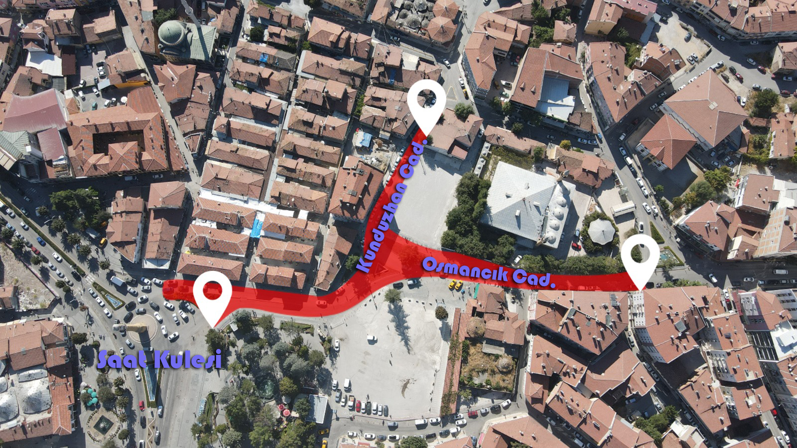 Kunduzhan Caddesi’nin Paşa Hamamı’ndan Merkez  SimitFırını’na kadar olan bölümü, Osmancık Caddesi’nin de Saat Kulesi’nden Ulucami’ye kadar olan bölümü araç trafiğine kapatılacak.