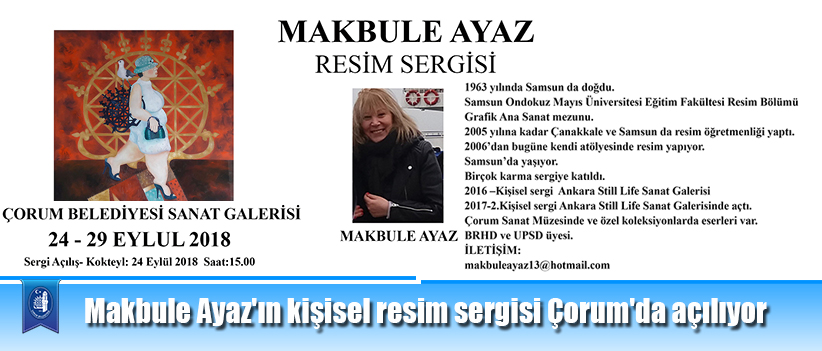 Çorum Belediyesi Sanat Galerisinde ve özel koleksiyonlarda eserleri bulunan, kendine has tekniklerle çalışan ünlü ressam Makbule Ayaz’ın “Makbule Ayaz Resim Sergisi” isimli kişisel sergisi, Çorum Belediyesi Sanat Galerisi’nde 24 Eylül 2018 Pazartesi günü saat 15.00’da açılacak ve 29 Eylül 2018 tarihine kadar ziyaret edilebilecek.