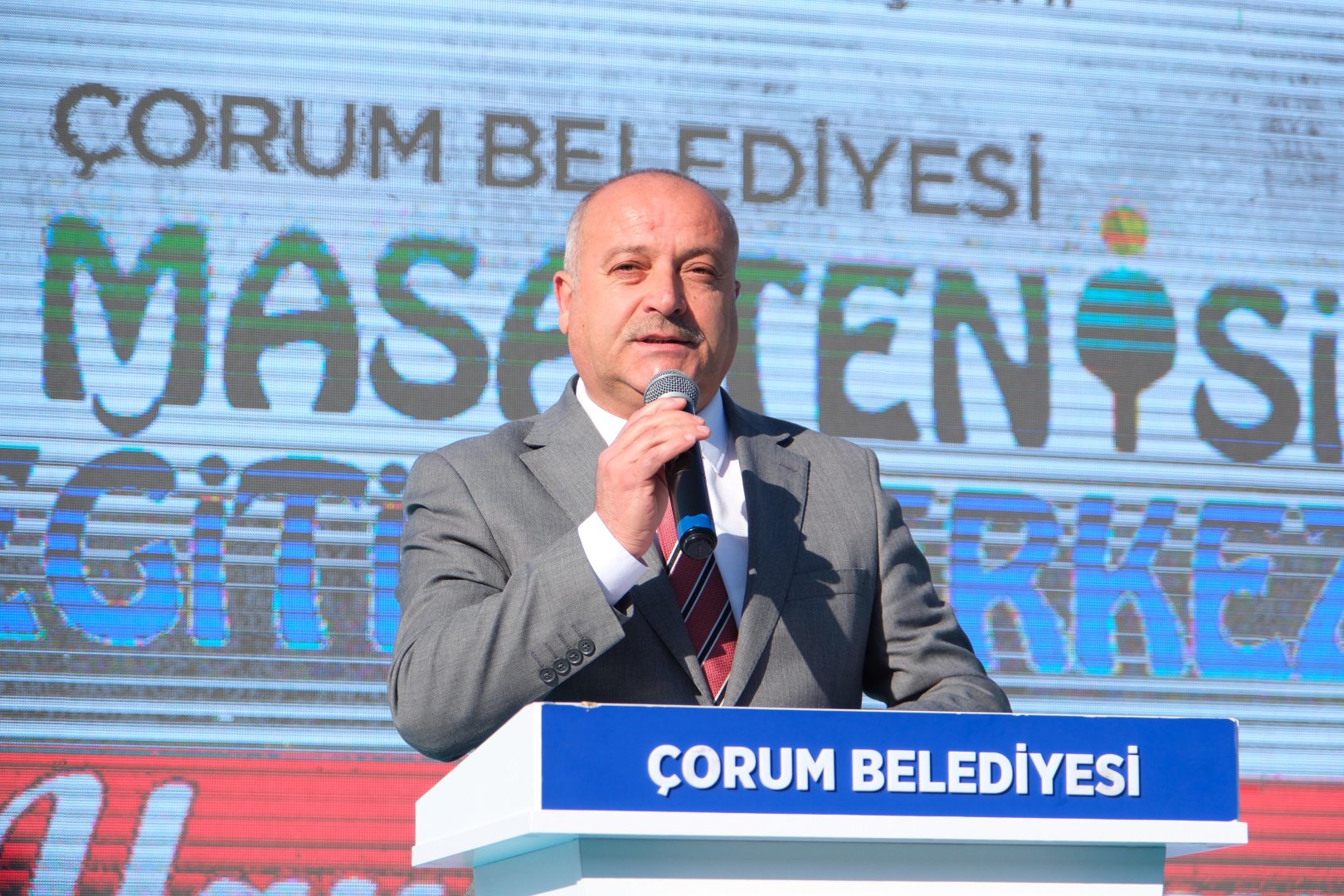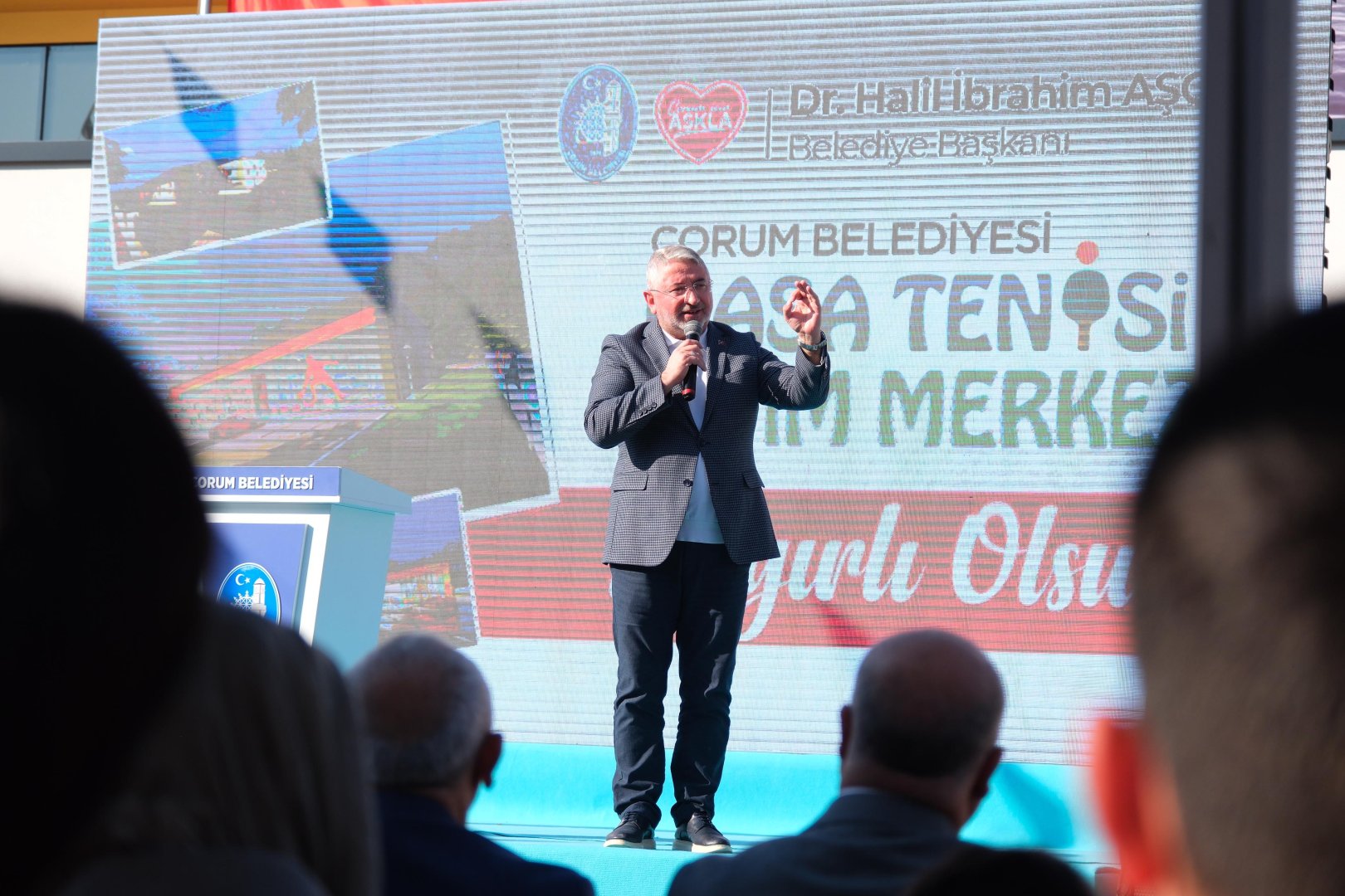 Masa Tenisi Eğitim Merkezi’nin açılış töreninde konuşma yapan Belediye Başkanı Dr. Halil İbrahim Aşgın, göreve geldiklerinde günden itibaren ‘Çorum’u spor şehri yapma’ yolunda emin adımlarla ilerlediklerini belirterek bu çalışmanın da bu hedefe giden yolda önemli bir adım olduğunu söyledi.Kazandırdıkları spor tesislerinin Çorum sporunun gelişimi için çok büyük önem taşıdığını belirten Aşgın, “Pehlivan yatağı Çorum’a modern bir güreş eğitim merkezi kazandırıyoruz. Yapımı sona gelinde inşallah önümüzdeki günlerde böyle bir açılış töreninde daha bir araya geleceğiz. Güreş’de Süper Ligde hem grekoromen hem serbest ligde mücadele eden bir kaç ilden biriyiz. Serbest güreşde Türkiye ikincisi olarak büyük bir başarıya imza attık. Masa Tenisinde de Süper Lig’de bayan ve erkek takımlarımız mücadele ediyor ve başarılı sonuçlar alıyorlar. Bu tesisin tamamlanması ile ilimizi yeni milli sporcuların kazandırılması adına önemli katkısı olacağına inanıyorum. Tesisin maliyeti 21 milyon lira bunun 15 milyonu Bakanlık verdi. Bu katkılarından dolayı önceki dönem bakanımız Mehmet Kasapoğlu ve yeni bakanımız Osman Aşkın Bak’a teşekkür ediyorum. Böyle güzel bir tesisi cumhuriyetimizin kuruluşunun 101. yılında hizmete açmanın ayrı bir onur ve gururunu yaşıyoruz. Tesisin ilimizi ve ülkemize hayırlı olmasını diliyorum’ dedi.
