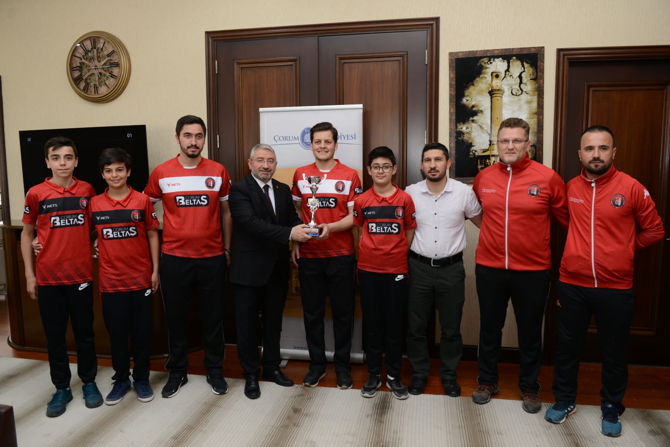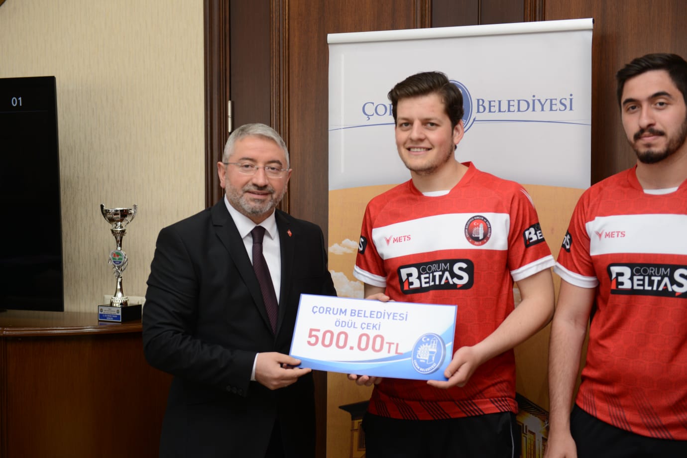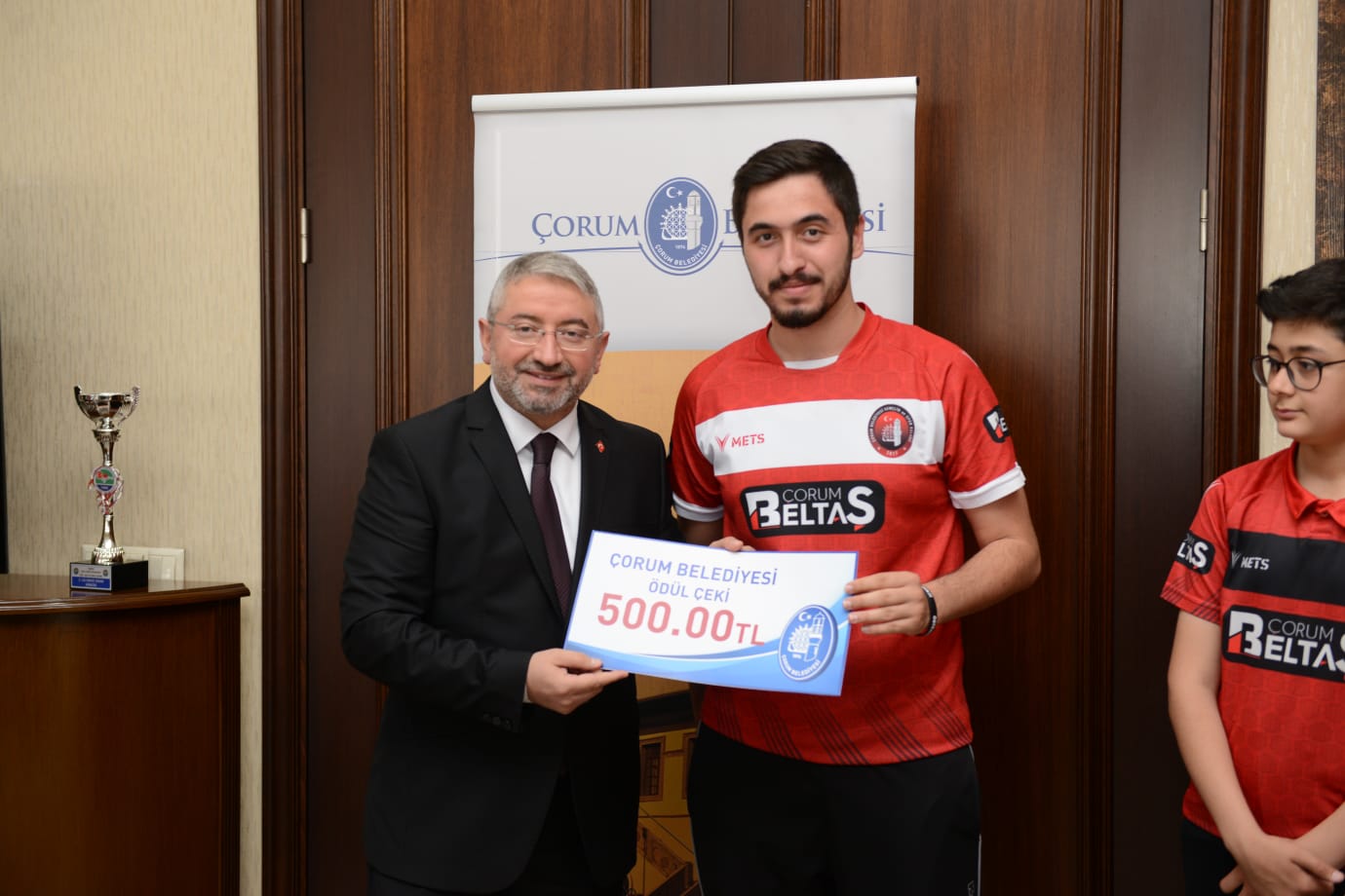 Çorum Belediyesi Gençlik ve Spor Kulübü Masa Tenisi takımını makamında ağırlamaktan dolayı memnuniyetini dile getiren Belediye Başkanımız Dr. Halil İbrahim Aşgın, sporcuları tek tek tebrik ederek 500 TL para ile ödüllendirdi. Kupayı teslim aldıktan sonra kısa bir açıklama yapan Belediye Başkanımız Dr.Halil İbrahim Aşgın, “16 takım arasında büyük bir başarıya imza atarak 1.Lig’e yükselen Çorum Belediye Gençlik ve Spor Kulübü’nü canı gönülden tebrik ediyorum. Biz belediye olarak her zaman spora ve sporcuya destek vermeye hazırız. İnanıyorum ki bu aslan parçası çocuklarımız 1.Lig’de de aslanlar gibi mücadele edip Çorum’u Süper Lig’ çıkaracaklardır” ifadelerine yer verdi.