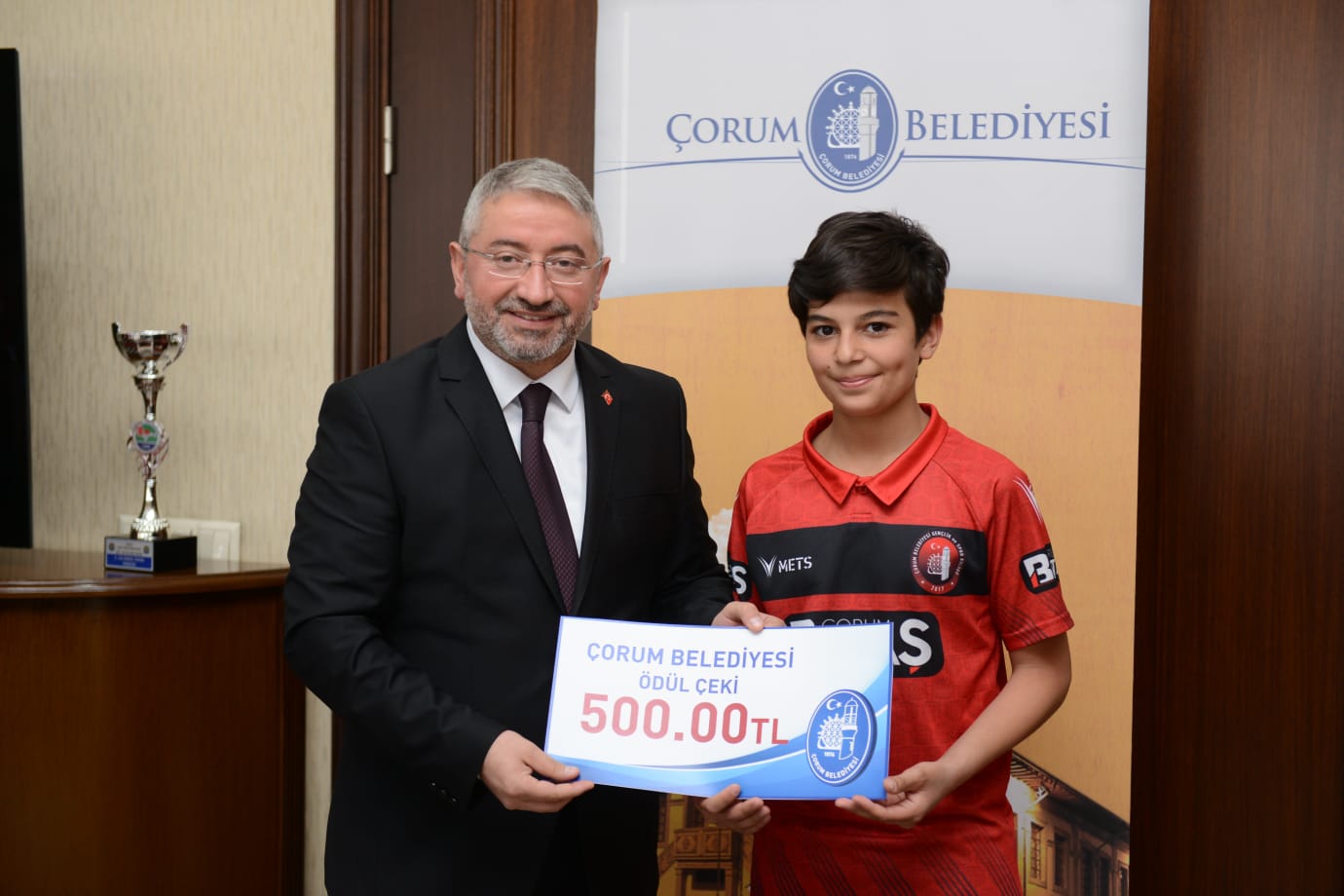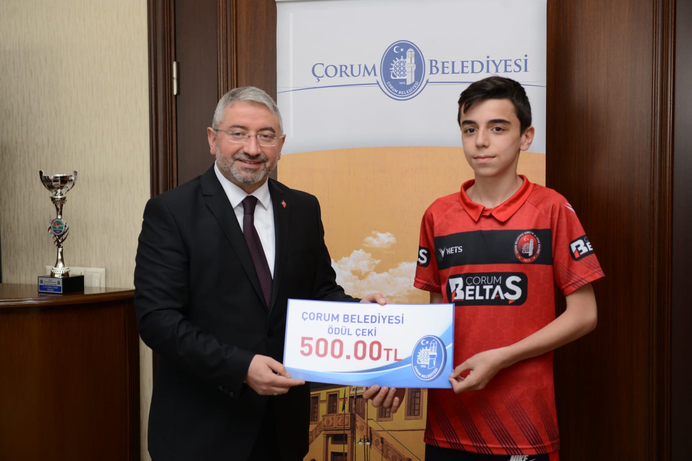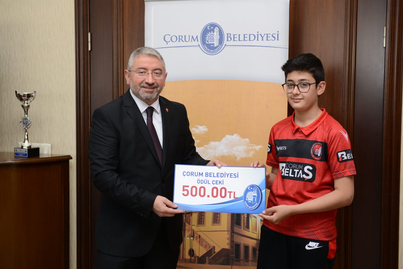 Çorum Belediyesi Gençlik ve Spor Kulübü Masa Tenisi takımını makamında ağırlamaktan dolayı memnuniyetini dile getiren Belediye Başkanımız Dr. Halil İbrahim Aşgın, sporcuları tek tek tebrik ederek 500 TL para ile ödüllendirdi. Kupayı teslim aldıktan sonra kısa bir açıklama yapan Belediye Başkanımız Dr.Halil İbrahim Aşgın, “16 takım arasında büyük bir başarıya imza atarak 1.Lig’e yükselen Çorum Belediye Gençlik ve Spor Kulübü’nü canı gönülden tebrik ediyorum. Biz belediye olarak her zaman spora ve sporcuya destek vermeye hazırız. İnanıyorum ki bu aslan parçası çocuklarımız 1.Lig’de de aslanlar gibi mücadele edip Çorum’u Süper Lig’ çıkaracaklardır” ifadelerine yer verdi.
