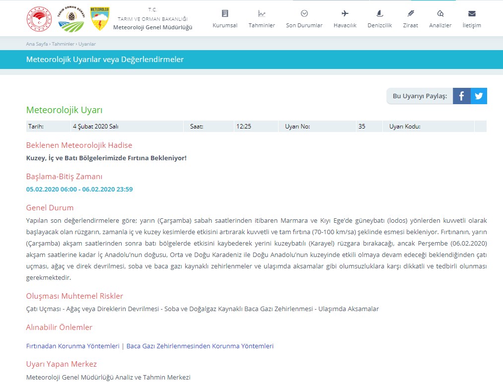 5 Şubat Çarşamba günü sabah saat 06.00 saatlerinde başlayıp 6 Şubat Perşembe günü 23.59’a kadar etkili olması beklenen fırtınanın hızının saatte 70-100 km arasında değişeceği bu nedenle de gerekli tedbirlerin alınması gerektiği vurgulandı. Açıklamada “Çatı uçması, ağaç ve direk devrilmesi, soba ve baca gazı kaynaklı zehirlenmeler ve ulaşımda aksamalar gibi olumsuzluklara karşı dikkatli ve tedbirli olunması gerekmektedir” denildi.