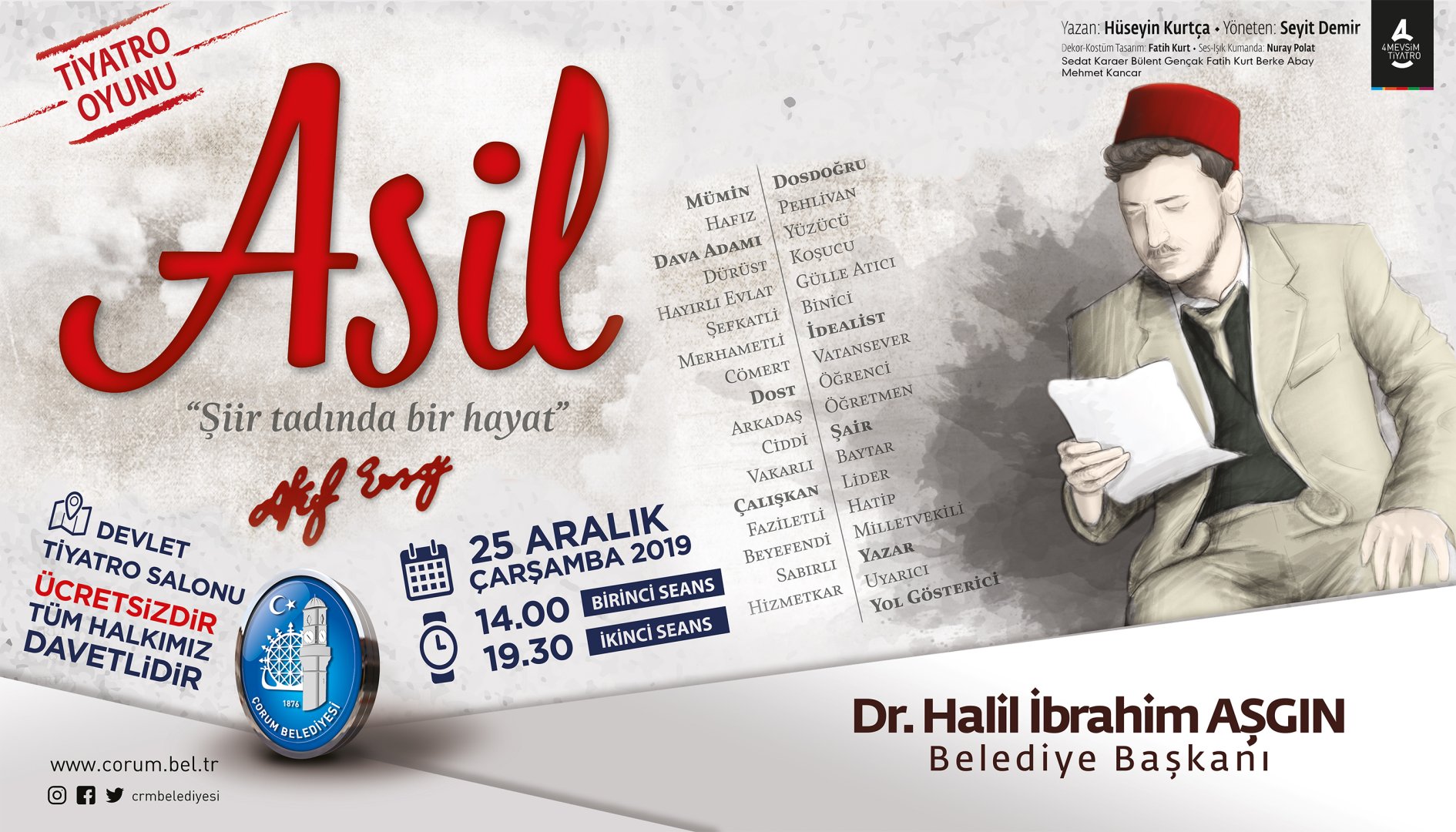 ‘Asil’ adlı tiyatro oyunu 25 Aralık Çarşamba günü saat 14.00 ve 19.30 olmak üzere 2 seans şeklinde Çorumlularla buluşacak. Belediye Başkanımız Dr. Halil İbrahim Aşgın Hüseyin Kurtça’nın yazdığı, Seyit Demir’in yönettiği tiyatro oyununa tüm Çorumluları davet etti.