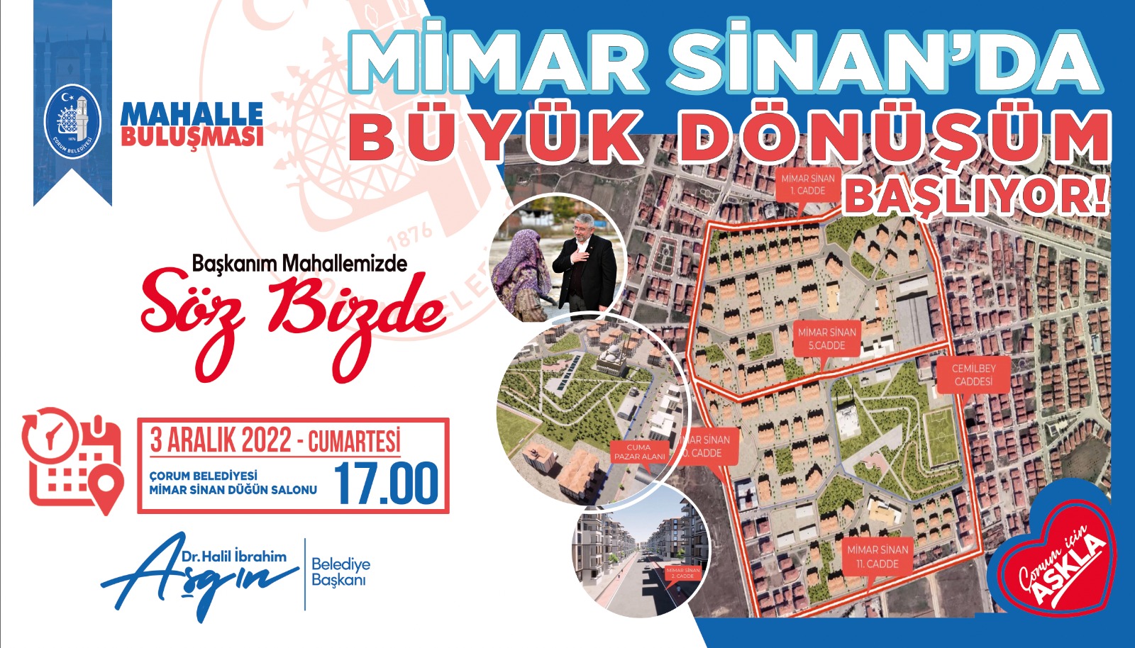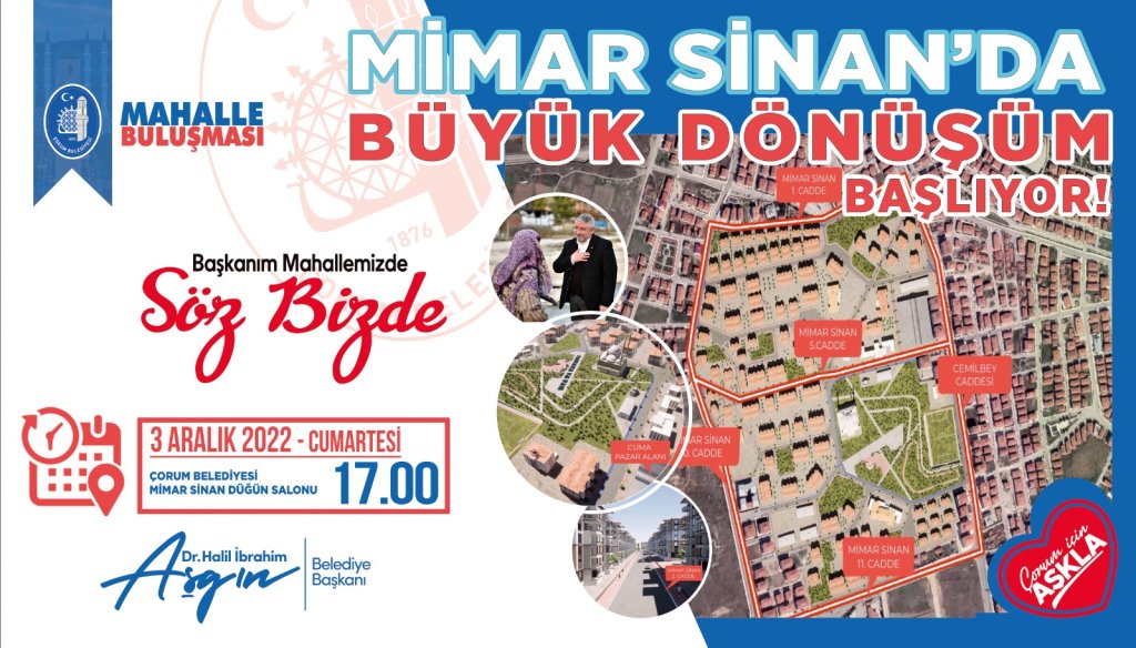 Çorum’un en merkezi noktalarından biri olan Kale Mahallesinde bakanlık ve TOKİ marifetiyle yapılacak kentsel dönüşümün müjdesini veren ardından Gülabibey Mahallesi sakinlerine Hasan Paşa Sokaklarda kentsel dönüşümü başlatacak revizyon imar planını açıklayan Belediye Başkanı Aşgın, Mimar Sinan sakinlerinin de yıllardır beklediği imar düzenlemesiyle ilgili yaptıkları çalışmayı açıklayacaklarını vurguladı. Aşgın, 3 Aralık Cumartesi günü yapılacak düğün salonu açılışının ardından “Başkanım Mahallemizde Söz Bizde”programı kapsamında Mimar Sinan Mahalle sakinleriyle bir araya gelerek 2 bin 165 hane ve 7 bin 170 kişiyi ilgilendiren 42 hektarlık alanda yapılan revizyon imar planıyla ilgili bilgiler verecek.