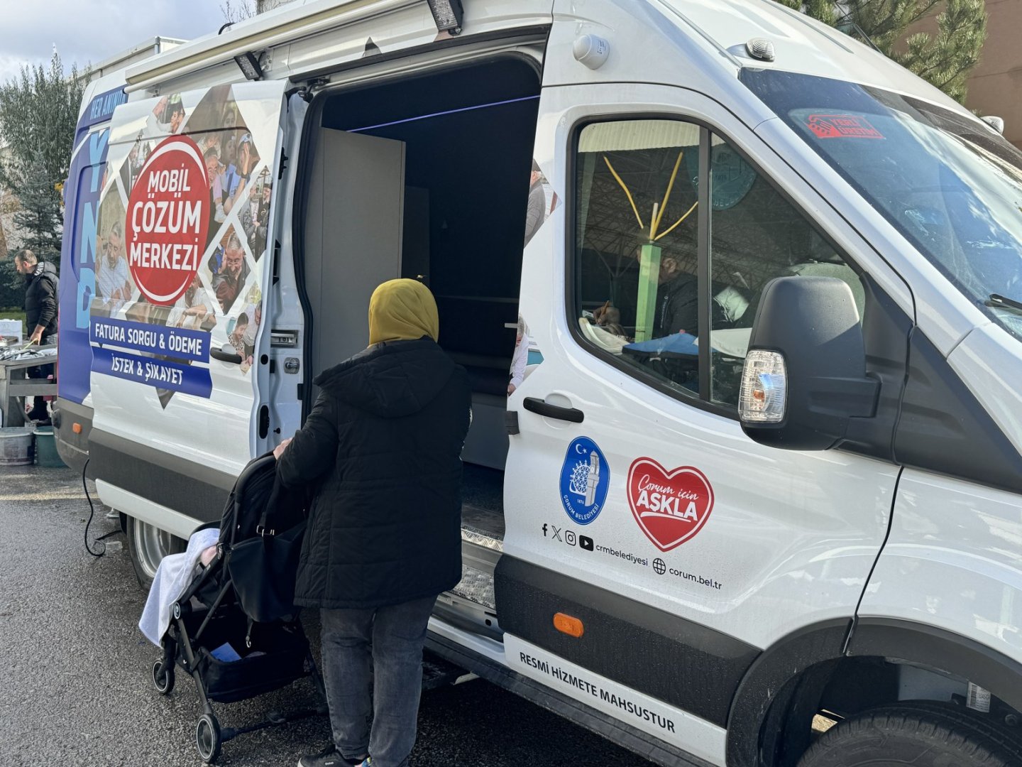 Çorum Belediyesi tarafından özel tasarlanan Mobil Çözüm Merkezi aracı ile belediyenin fatura ve vergi tahsilât işlemleri artık mahallelerde vatandaşların ayağına gidecek. Mobil Çözüm Merkezi görevlileri aynı zamanda vatandaşların istek ve şikâyetlerini de dinleyecek.  Mobil Çözüm Merkezi aracı her gün farklı bir mahallede, semt pazarlarının olduğu yerlerde bulunacak.