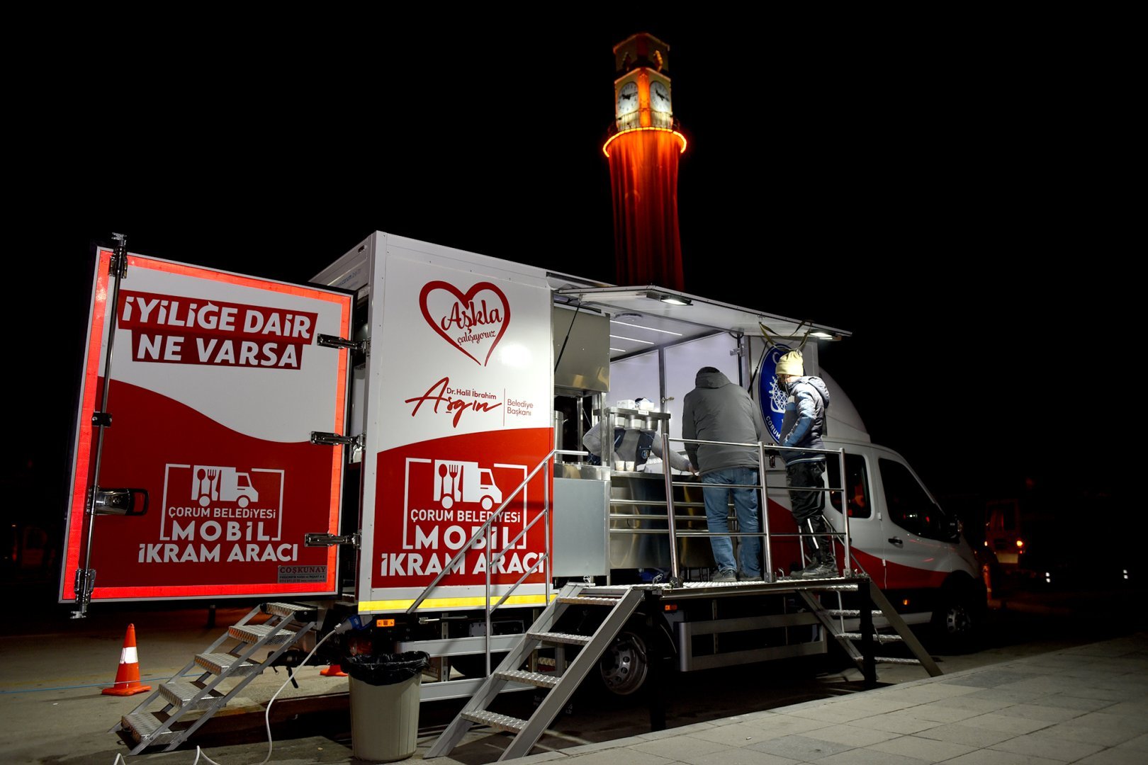 Çorum Belediyesi Mobil İkram aracı hizmete başladığı günden bu zamana kadar 400 bin kişiye hizmet verdi. İl içerisinde özel ve dini günlerde hizmet sürdüren Mobil İkram Aracı, ülke genelinde yaşanılan olumsuz durumlarda da hizmet veriyor. 6 Şubat deprem felaketinde afet bölgesine gönderilen ekip vatandaşlara sıcak çorba ikramında bulunurken, yangın ve sel gibi ülke genelinde yaşanılan felaketlerde de vatandaşlara çorba, çay, salep ve limonata ikramında bulunarak yardıma koşuyor.