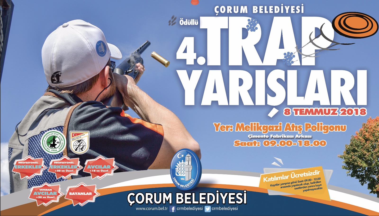 Gül, “Çorum Tüm Avcılar ve Atıcılar Derneği ile birlikte 08 Temmuz 2018 Pazar günü 09.00-18.00 saatleri arasında Çimento Fabrikası arkasında bulunan Melikgazi Atış Poligonu’nda yapılacak olan trap yarışları “Erkekler Veteran 50 yaş ve üzeri, Avcular Genel 18 yaş ve üzeri, Avcılar Veteran 50 yaş ve üzeri, Büyük Erkekler, Genç Erkekler, Bayanlar, olmak üzere 6 kategoride yapılacak. Trap yarışlarına il dışından da sporcuların katılacağını bekliyoruz. Bir çok sporcunun yarışacağı trap müsabakalarında dereceye giren yarışmacılara kupa, madalya ve para ödülleri verilecek. Ayrıca yarışmaya katılımın ücretsiz. Yarışmacıların fişek ve plak ihtiyacını Çorum Belediyesi tarafından karışlanacak. Gelen atıcı ve misafirlere öğle yemeği ikramında bulunacağız. 08 Temmuz Pazar günü Çimento Fabrikası’nın arkasında bulanan Melikgazi Atış Poligonu’nda düzenlenecek 4. Trap Yarışları’na tüm Çorum halkını davet ediyoruz” diye konuştu.