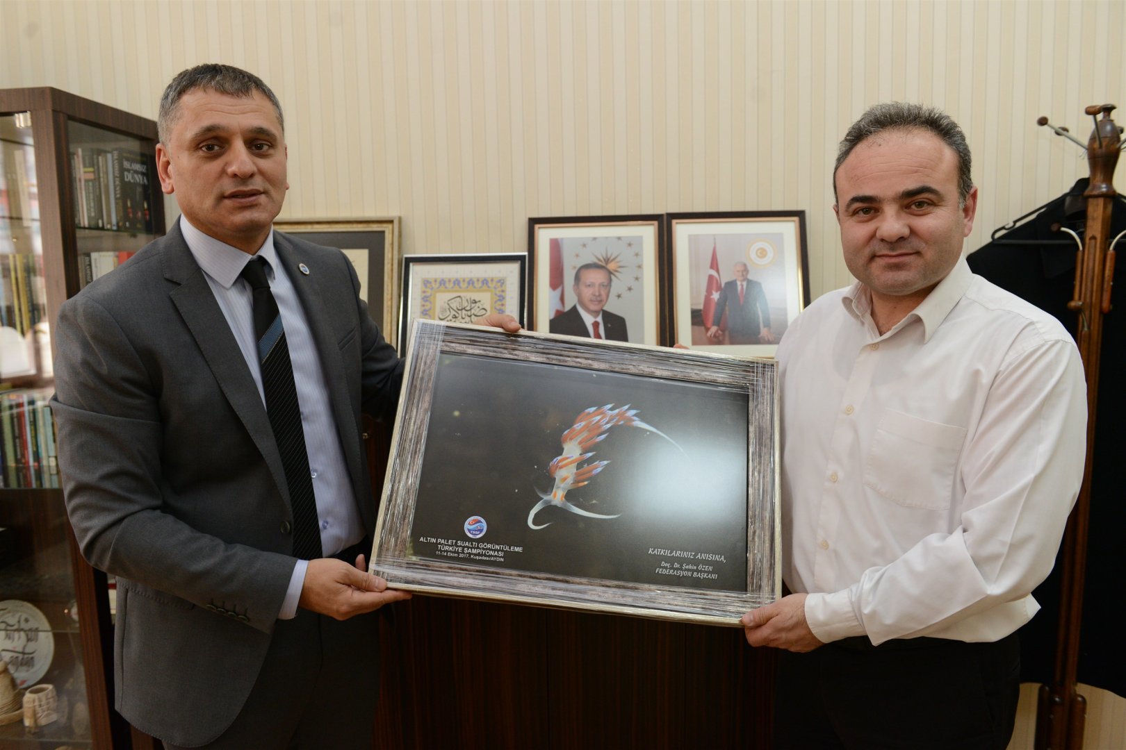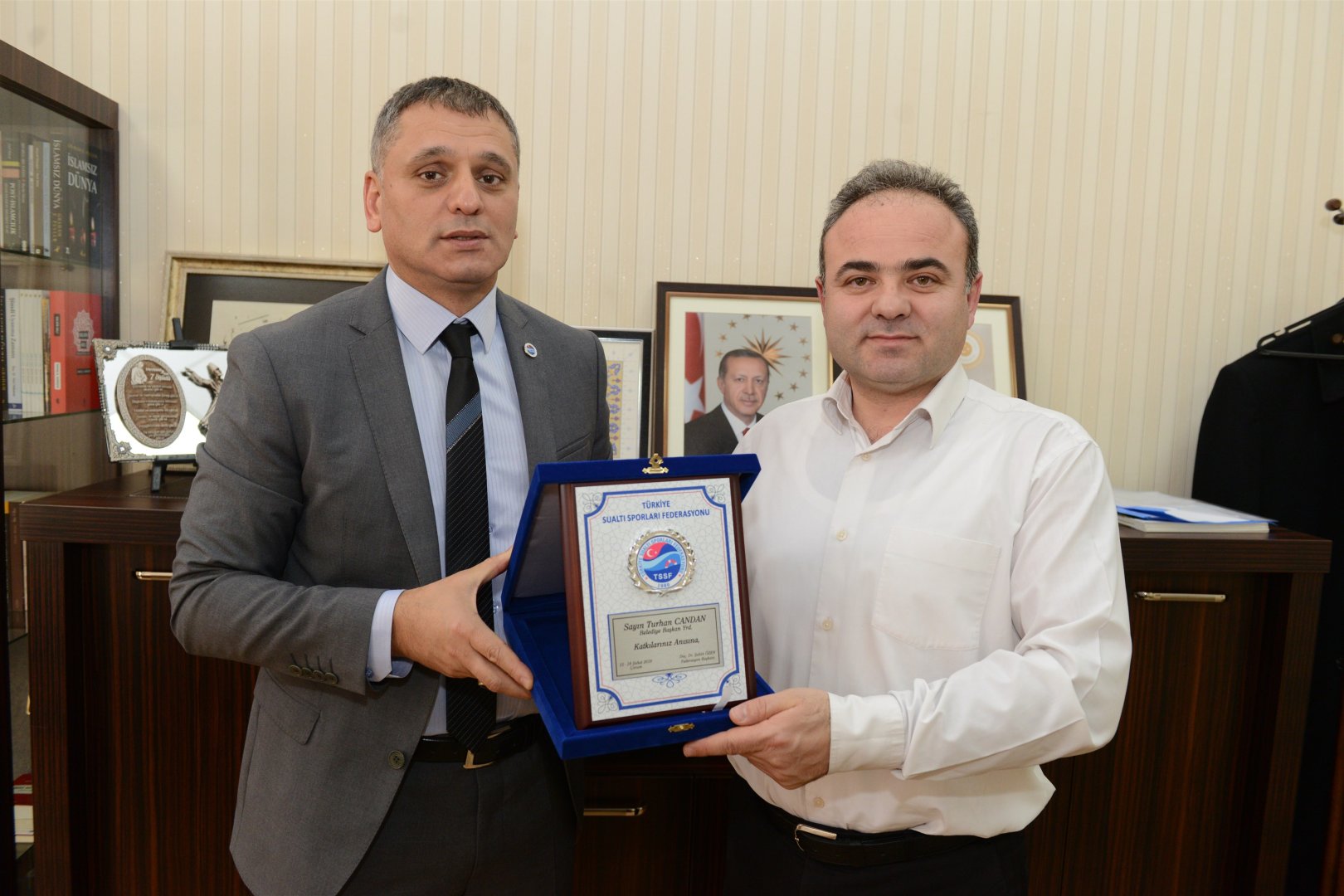 Türkiye Sualtı Sporları Federasyonu Paletli Yüzme Kulüplerarası Gençler Türkiye Şampiyonası için Çorum’a gelen TSSF Başkanı Doç. Dr. Şahin Özen, Belediye Başkan Yardımcısı Turhan Candan’ı ziyaret etti.