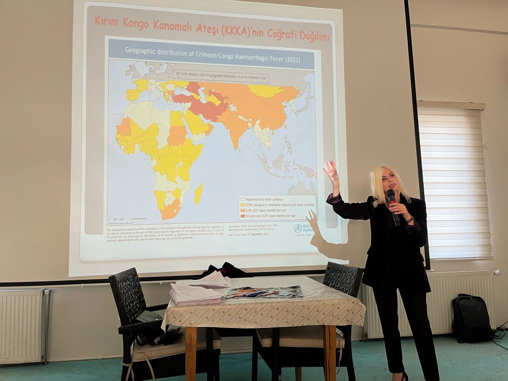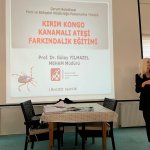 Park ve Bahçeler Müdürlüğü’nde MEHAM Müdürü Prof.Dr. Gülay Yılmazel tarafından gerçekleştirilen eğitime Park ve Bahçeler Müdürlüğü bünyesinde görev yapan personeller katıldı. Yılmazel yaklaşan bahar ayları birlikte görülen KKKA hastalığının öneminden bahsetti. Kene vakalarıyla karşılaşılması halinde yapılması gerekenler hakkında da bilgiler veren Prof.Dr. Gülay Yılmazel “  Kırım-Kongo Kanamalı Ateşi (KKKA) hastalığı, ülkemizde bahar ve yaz aylarında görülen ve başlıca kene tutunması veya keneyle temas sonucunda bulaşan ve ölümle sonuçlanabilen önemli bir enfeksiyon hastalığıdır. Havaların ısınmaya başlaması ile hastalığın bulaştırıcı olan keneler aktif hale gelmektedir. Hastalığın önlenmesinde  en önemli husus kişisel korunma tedbirlerinin alınmasıdır. Özellikle parklarda ve bahçelerde görülen kenelerle acil olarak ilgili amirlerinize ve İl Sağlık Müdürlüğümüze haber vermeniz gerekmektedir” ifadelerini kullandı.