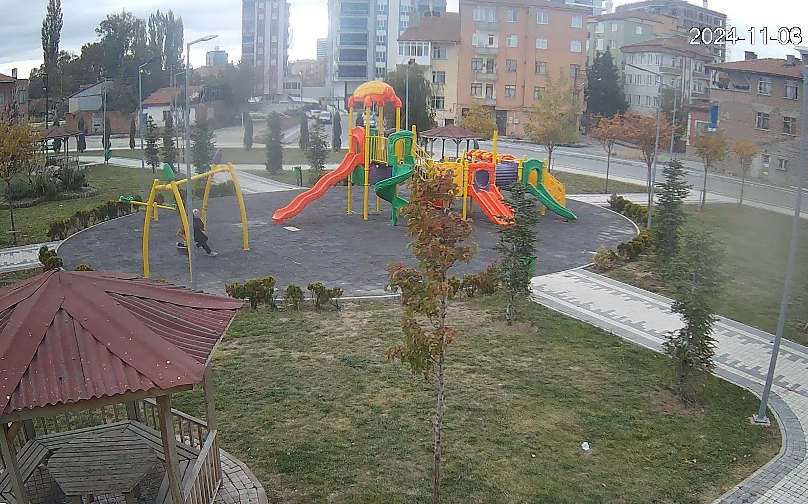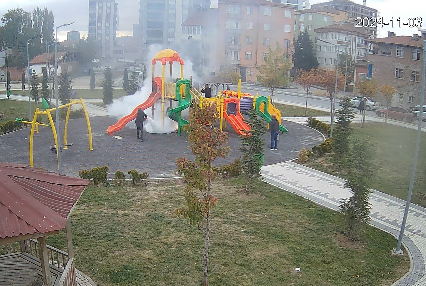 Olay Azerbaycan Caddesi’ndeki oyun parkında meydana geldi. Parkta oynayan iki çocuk, kağıt ve yanıcı maddelerle oyun gurubunu ateşe verdi. O anlar, Kunduzhan Mahallesi Muhtarlığı’na ait güvenlik kameraları tarafından kaydedildi.