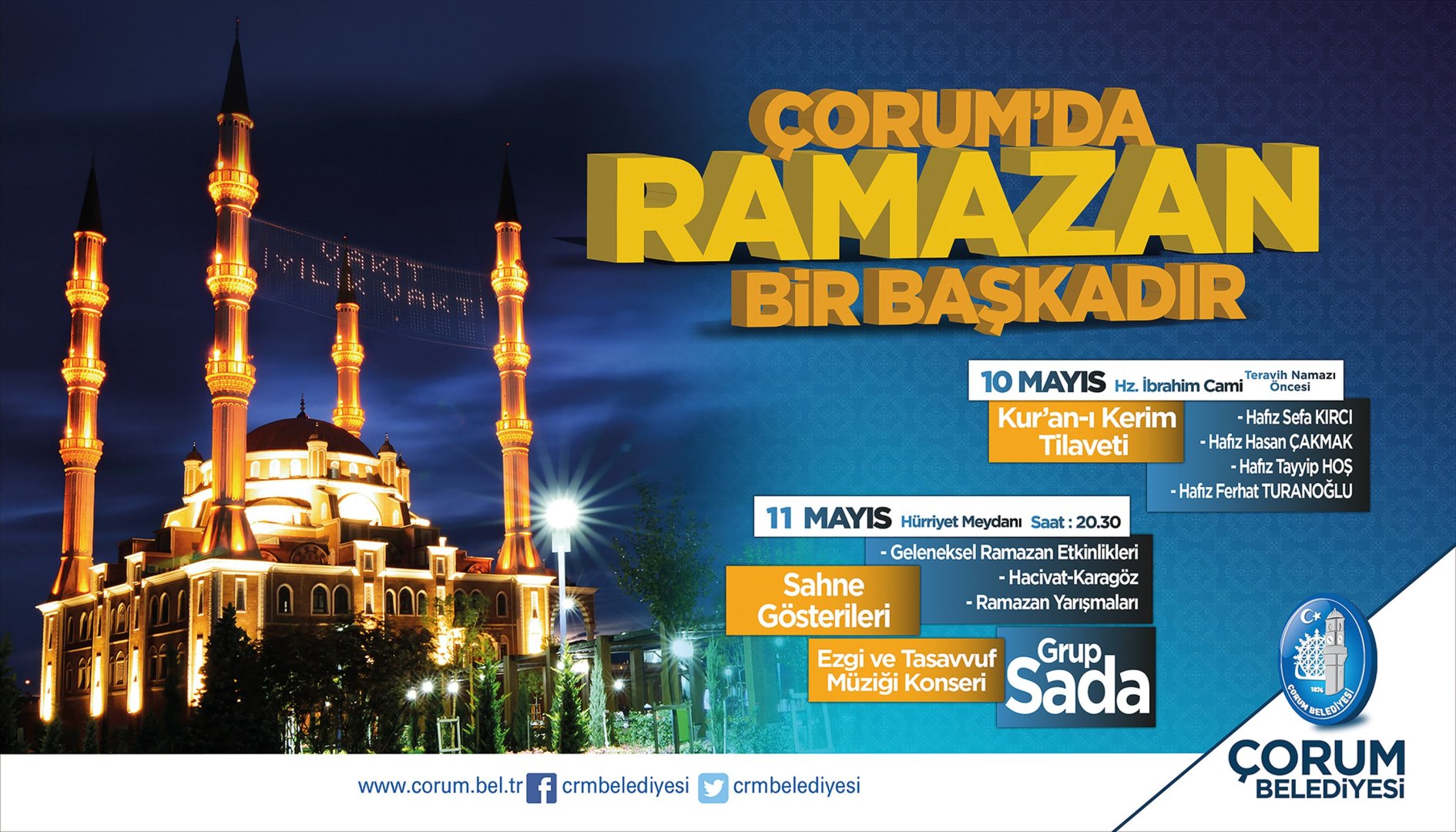 Ramazan etkinlikleri ile ilgili bilgi veren Belediye Başkanımız Dr. Halil İbrahim Aşgın “Öncelikle başı rahmet, ortası mağfiret, sonu cehennemden kurtuluş olan mübarek Ramazan ayında yaptığımız ibadet ve dualarımızın kabul olması dileğiyle tüm hemşehrilerimizin ve İslam aleminin ramazanını tebrik ediyor hayırlar getirmesini diliyorum. Belediye olarak her yıl kurulan iftar çadırımızın yanı sıra bu yıl 15 Temmuz Hürriyet Meydanı’nda çeşitli etkinlikler yapacağız. Etkinliklerimizin yanı sıra her Cuma akşamı bir camimizde Çorum’un tanınmış hafızlar tarafından Kur’an-ı Kerim tilaveti sunulacak. Hafız Sefa Kırcı, Hasan Çakmak, Tayyip Hoş, Ferhat Turanoğlu, Numan Akbaş, ve Adem Kemaneci tarafından 10 Mayıs Cuma akşamı Hz.İbrahim Cami’nde başlayacak olan Kur’an-ı Kerim tilavetimiz 17 Mayıs Cuma akşamı Fatih Cami, 24 Mayıs Abdibey Cami ve 31 Mayıs Kadir Gecesi’nde Akşemseddin Cami’nde teravih namazı öncesinde gerçekleştirilecek. Yine Ramazan etkinliklerimiz kapsamında her Cumartesi akşamı 15 Temmuz Hürriyet Meydanı’nda Hacivat-Karagöz, ramazan yarışmaları, çocuk oyunları, Meddah gösterileri gerçekleştirilecek” dedi.