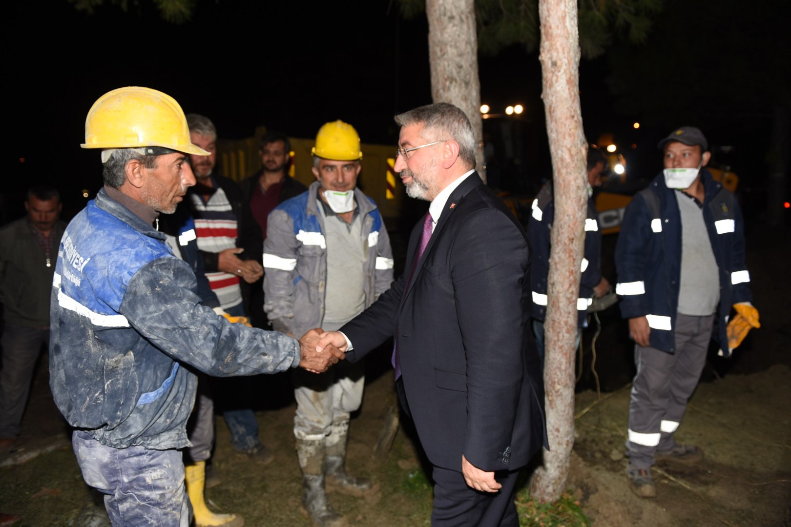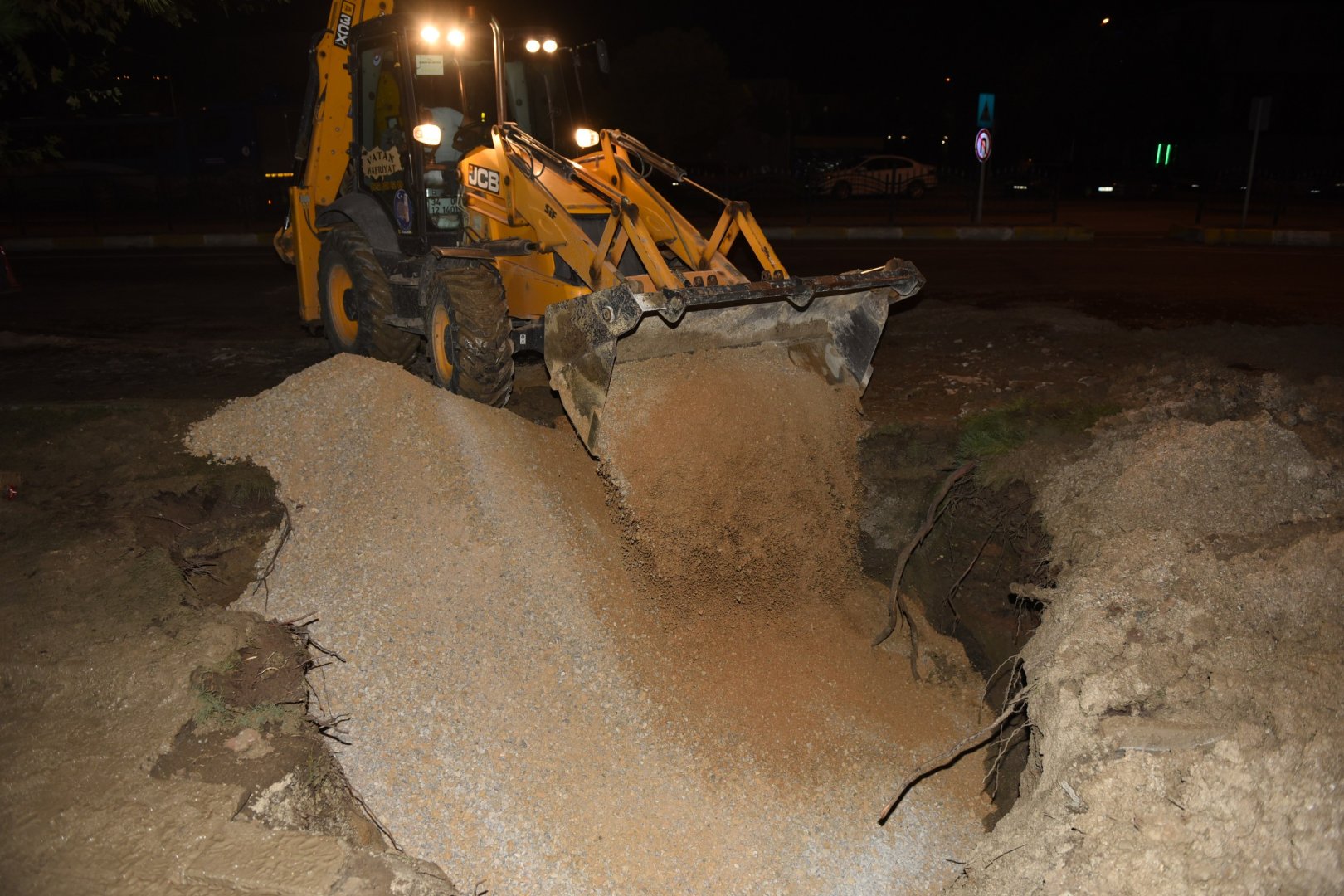 Ankara’dan gece program döşünü çalışma yapılan yere gelen Belediye Başkanımız Dr. Halil İbrahim Aşgın da çalışan ekipleri ziyaret ederek arıza giderilene kadar alandan ayrılmadı. Alt yapının çok zor bir iş olduğunu ifade eden Belediye Başkanımız Dr. Halil İbrahim Aşgın, “Ama eğer biz bu makamlardaysak, bu emanetler bize verildiyse, millet bize güvendiyse milletimizin güvenini boşa çıkarmamak ve emanete sahip çıkmak durumundayız. Gece-gündüz demeden belediyemizin tüm birimleriyle şehrimiz ve hemşehrilerimiz için koşuyoruz. Ana hattın geçtiği Cemilbey Caddesi’nde Su ve Kanalizasyon Müdürlüğü ekiplerimiz 8-9 saat çalışma yaptı. Personellerimizin özverili çalışması neticesinde arıza gece saat 01.00′ da giderildi. Şehrimizi susuz bırakmamak ve hemşehrilerimizin refahı için mesai mefhumu gözetmeksizin çalışan mesai arkadaşlarımıza teşekkür ediyorum. Emeklerine sağlık” dedi.