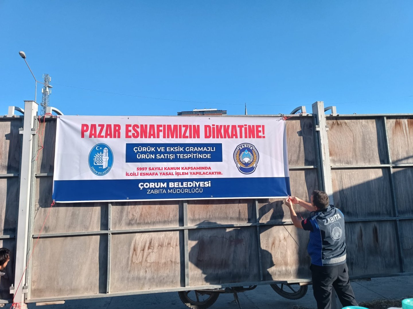 Çorum Belediyesi zabıta ekipleri semt pazarlarında çürük ve eksik gramajlı sebze-meyve satışı konusunda esnafı ve vatandaşları bilinçlendirmeye devam ediyor. Semt pazarlarında denetimlerini sıkılaştıran ekipler, kurallara uymayan esnafa yasal işlem yapılacağını bir kez daha hatırlattı.