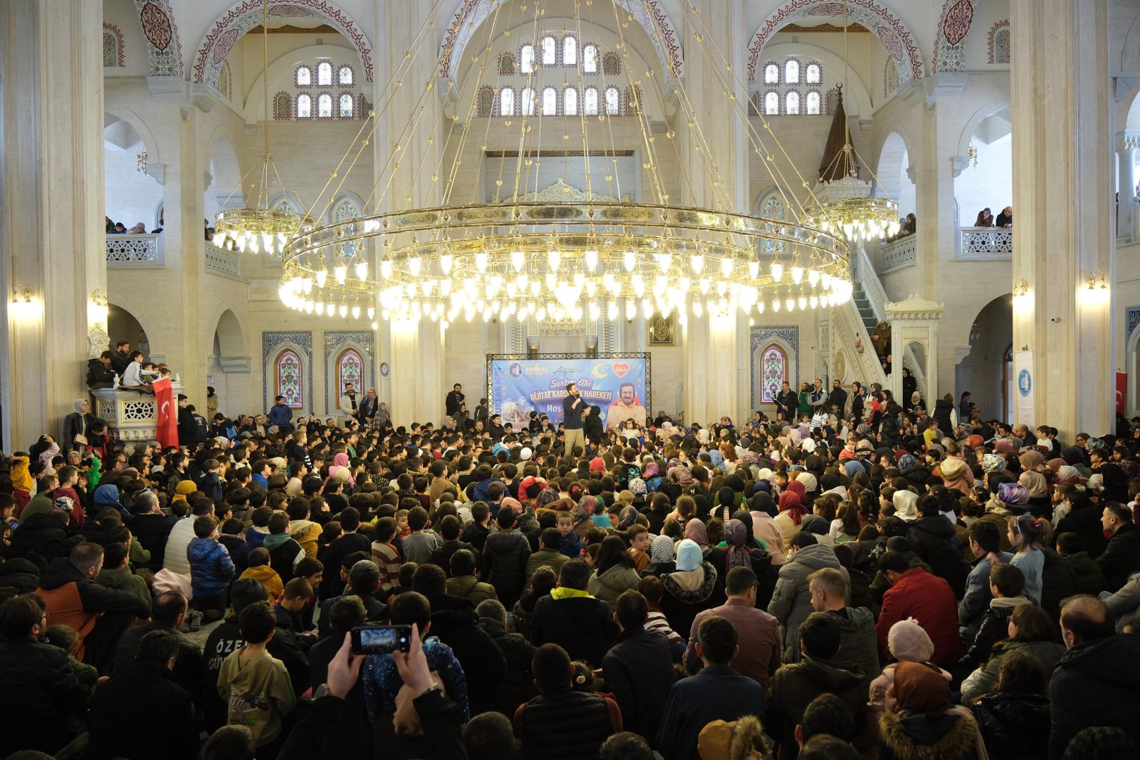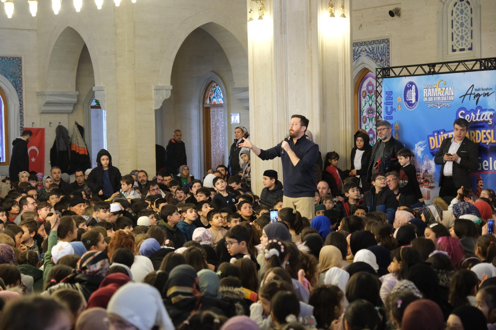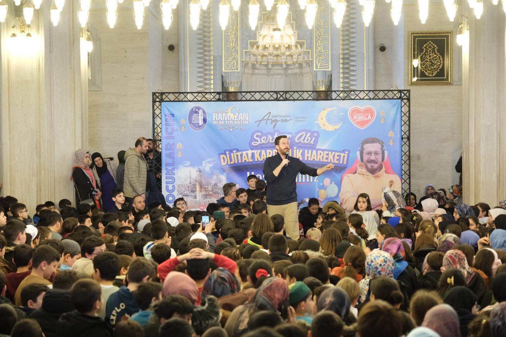 Akşemseddin Cami’nde öğle namazının ardından düzenlenen etkinliğe yüzlerce çocuk katıldı. Çocuklar, Youtuber, ve Sosyal Medyada çocukların sevdiği isimler arasında yer alan Sertaç Abi Dijital Kardeşlik etkinliğinde buluştu. Programı Belediye Başkanı Dr. Halil İbrahim Aşgın’ın yanı sıra yüzlerce çocuk ve aileleri de ilgi ile takip etti. Çocukların yoğun ilgisi ile karşılaşan Sertaç Abi sosyal medya hesaplarını takip ederken dikkatli olunması gerektiğinin altını çizdi. İnternet ortamında faydalı içeriklerin yanı sıra zararlı içeriklerin de olduğuna dikkat çeken Sertaç Abi; sosyal medyada yer alan her videoyu izlememeleri ve seçici olmaları uyarısında bulundu.