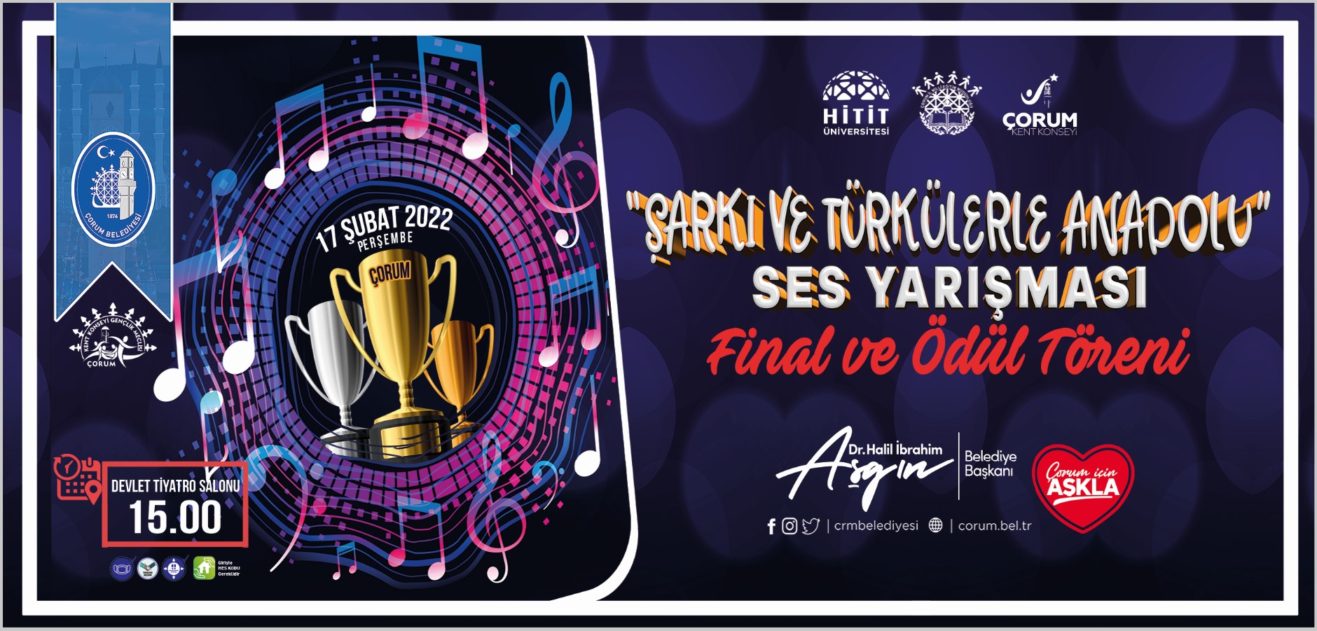 Belediyemiz, Hitit Üniversitesi, İl Milli Eğitim Müdürlüğü ve Kent Konseyi işbirliği ile düzenlenen “Şarkı ve Türkülerle Anadolu” ses yarışmasında final ve ödül töreni 17 Şubat Perşembe günü saat 15.00’te Devlet Tiyatro Salonu’nda yapılacak.