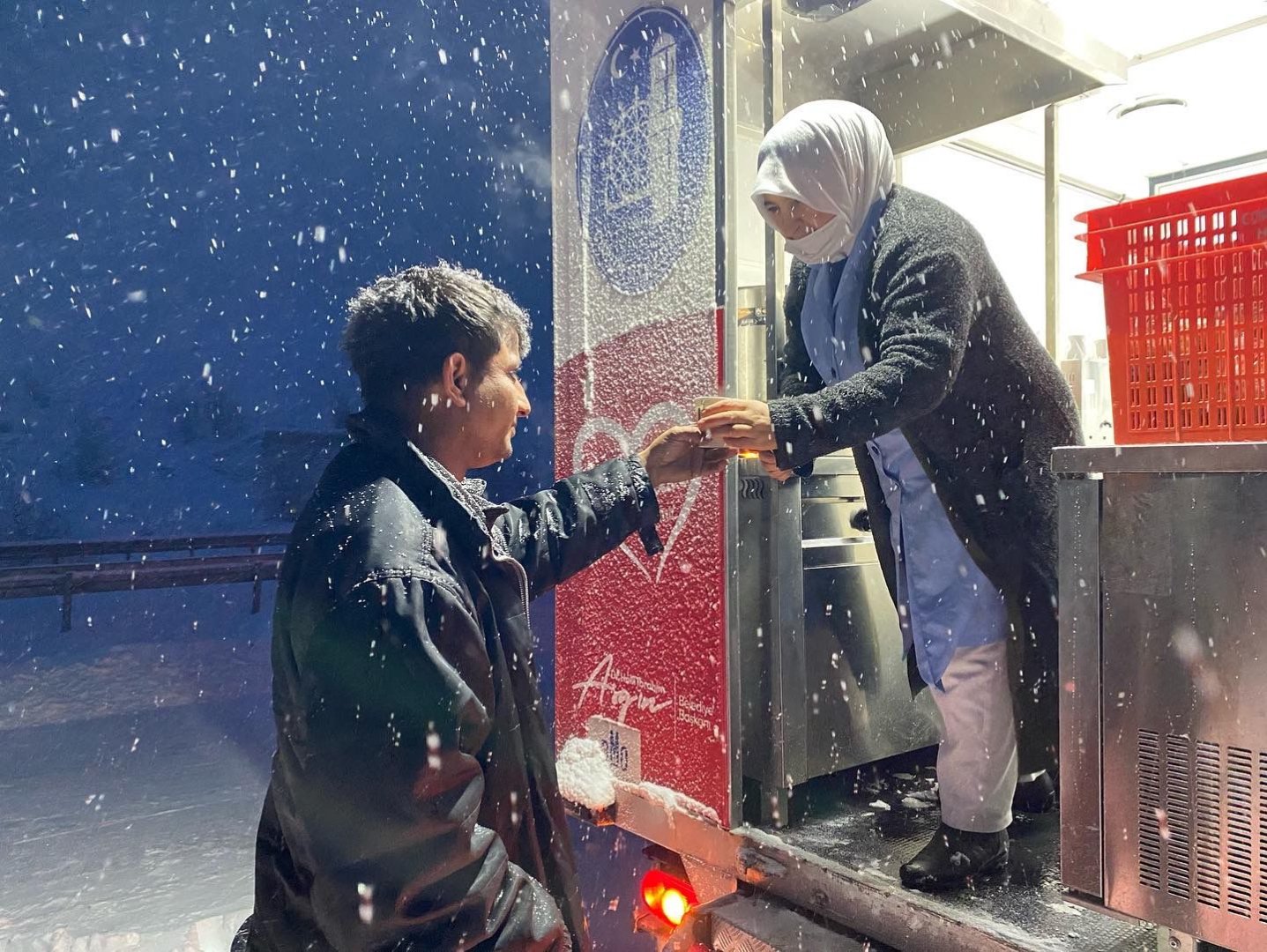 Belediyemizin Mobil İkram Aracı, yoğun kar yağışından etkilenen yolcu ve şoförler için sıcak çorba kaynattı.