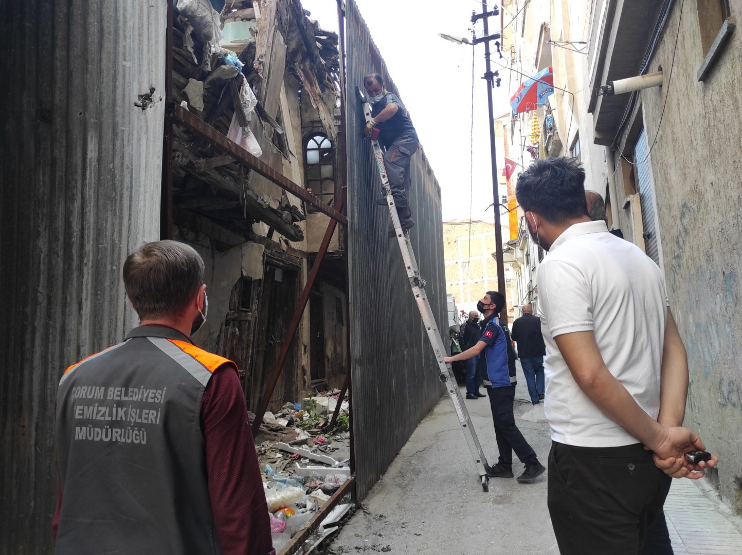 Üçtutlar Mahallesi Osmancık 2. Sokak’ta bulunan ve korunması gereken kültür varlığı olarak tescillenen bir binadan gelen çöp kokularından rahatsız olan vatandaşlar durumu Çorum Belediyesi Zabıta Müdürlüğü ekiplerine bildirdi. Yıkılma tehlikesine karşı daha önce tedbir olarak çevresine örülen sac korkulukları söken zabıta ekipleri manzara karşısında şok oldu. Evde inceleme yapan Belediye ekipleri, çöplerin çevredeki apartmanlardan atıldığını tespit ederek gerekli yasal işlemlerin başlatılması için konuyu Belediye Encümenine taşıdı.
