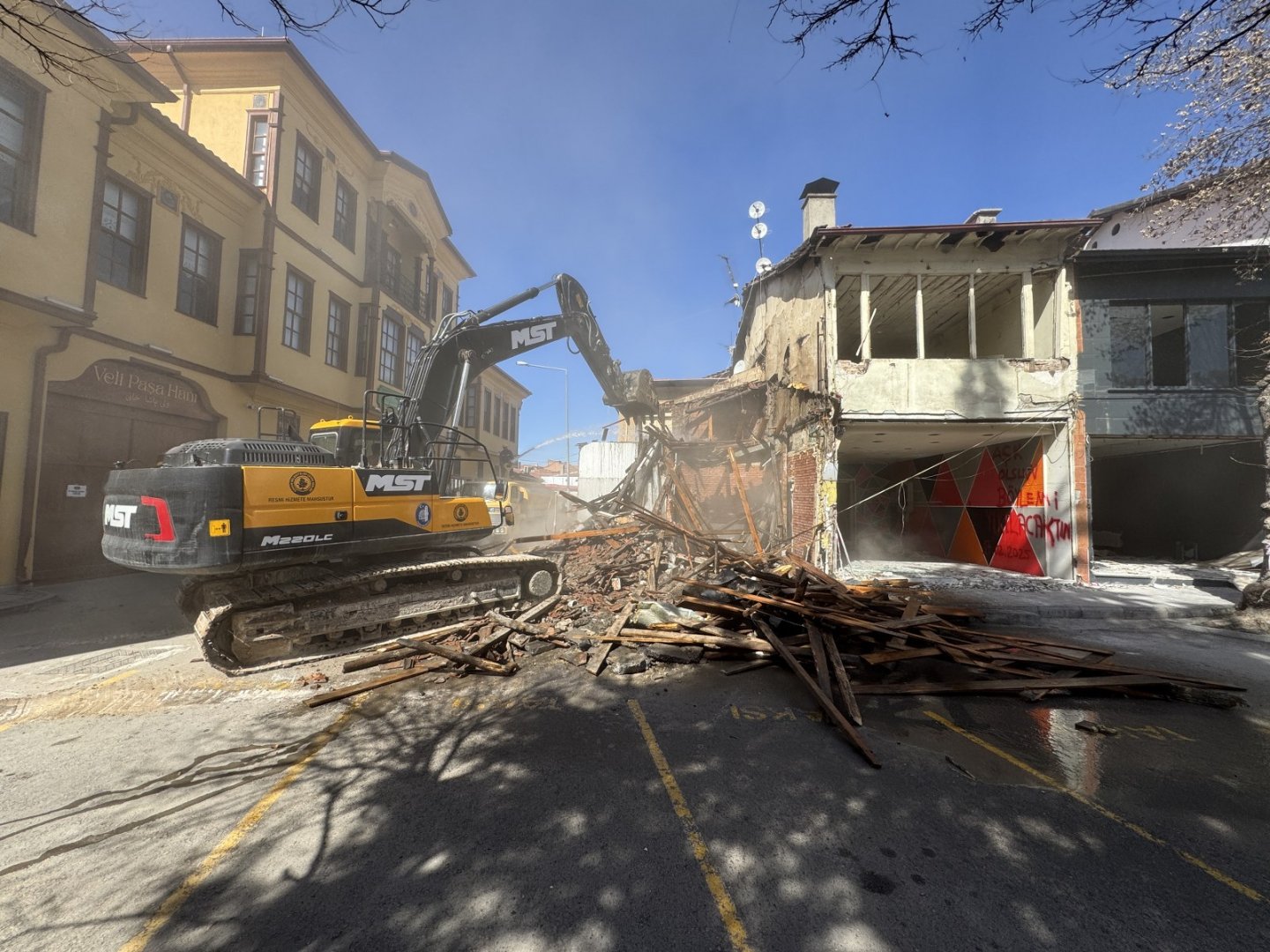 Veli Paşa Hanı önünde bulunan iş yerlerinde yıkım çalışmaları devam ediyor.