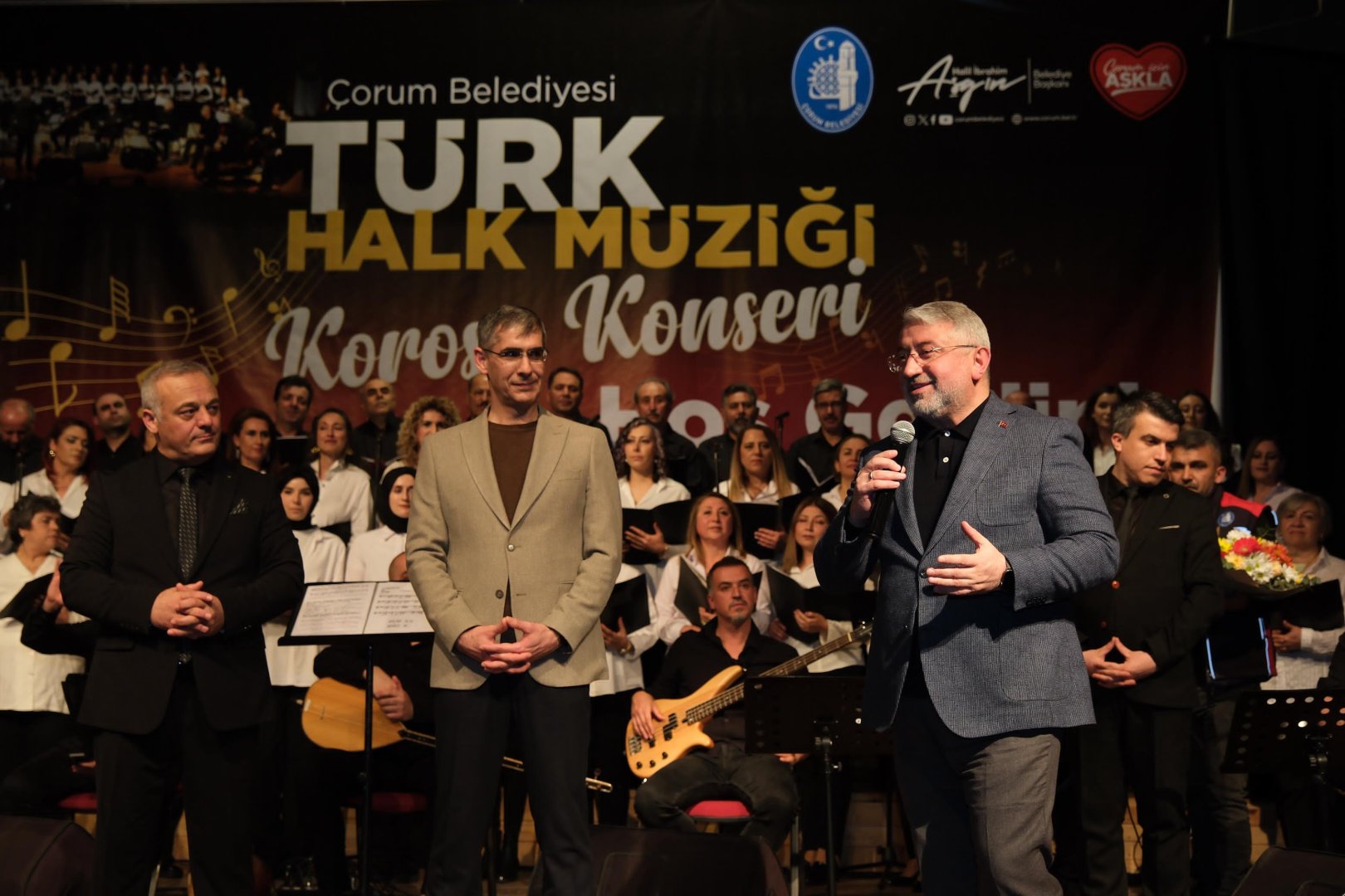 Belediye Başkanı Dr. Halil İbrahim Aşgın türkülerin sözlerinin rastgele yazılabilen sözler olmadığını ifade etti. Aşgın “Her bir türkü, her bir deyiş, sazın tınısı ne kadar büyük ve güzel bir milletin mensubu olduğumuzu bir kez daha hatırlattı. Geçmişimize baktığımızda bu türkülerin sözlerini yazanların kalp ve gönül yoğunluğuna bakıldığında türkülerin sözlerinin rastgele sözler olmadığını görürsünüz. Milletimle, geçmişimle, tarihimle ve koromuzla bir kez daha onur ve gurur duydum. Böylesine güzel eserleri bizlerle buluşturan gönül dilimizin mimarlarına selam olsun. Bugün koromuz ve solistlerimiz bir başkaydı. Şefimiz Arif Sadeçolak ve korosuna bizlere böyle güzel bir akşam yaşattıkları için teşekkür ediyorum” ifadelerini kullandı.