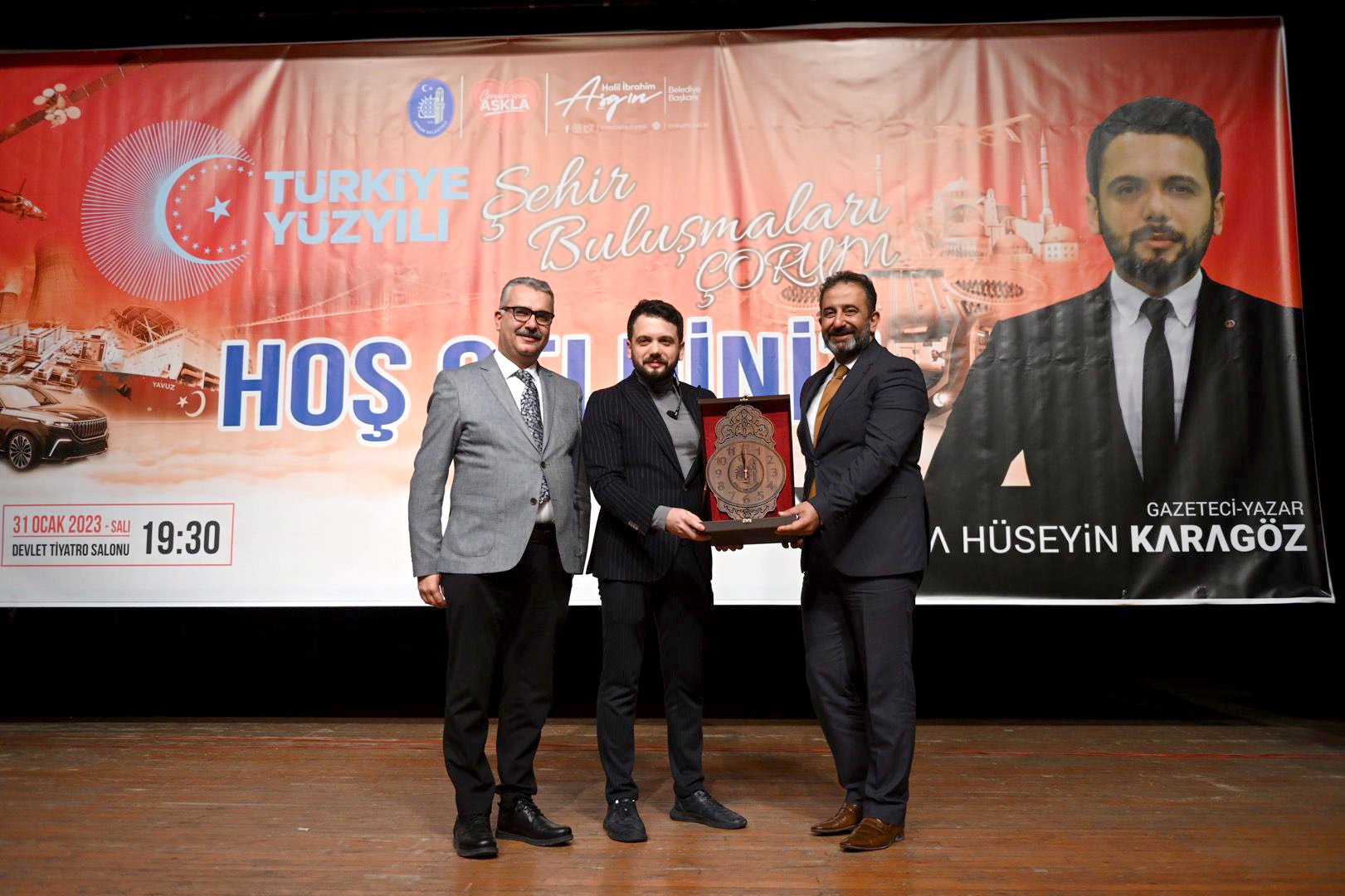 Çorum’dan da övgüyle söz eden Karagöz, “Tarihin ve gelişmişliğin harmanlandığı çok güzel bir şehir görmekten son derece memnuniyet duydum” dedi. Konferansın ardından Belediye Başkan Vekili İsmail Yağbat ve AK Parti Çorum İl Başkanı Yusuf Ahlatcı, Taha Hüseyin Karagöz’e günün anısına çiçek ve hediye takdim etti.