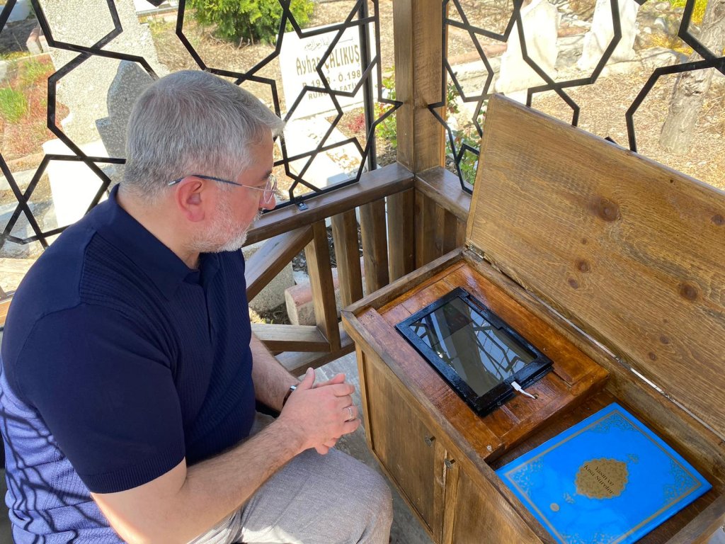 Ulu mezarlığın tepe noktasında medeniyet kodlarını yansıtan sade bir tasarıma sahip tefekkür alanı inşa ettiklerini dile getiren Başkan Aşgın “Bu alan içerisine mezarlık ziyaretinde bulunan hemşehrilerimiz okuyabilsinler diye Kur’an-ı Kerimler ve dua kitapları koyduk. Kur’an okumayı bilmeyenler için sesli olarak dinleyebilecekleri Diyanet İşleri Başkanlığımıza ait Kur’an-ı Kerim uygulamasının yüklü olduğu bir tablet yerleştirdik. Hemşehrilerimiz burada bir yandan Kur’an-ı Kerim okurken ve dinlerken bir tarafta mezarları, diğer tarafta akıp giden hayatı görsünler ve tefekkürde bulunsunlar istedik.” dedi.