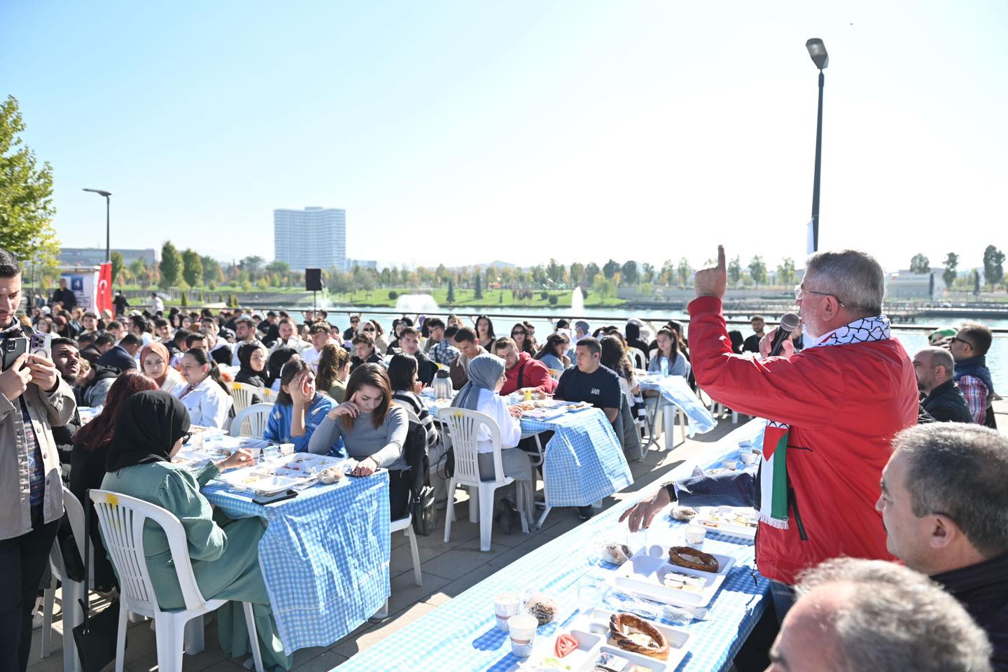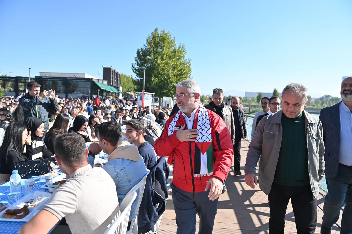 üzerinde TEKNOFEST montu ve Filistin atkısı ile katılan Belediye Başkanı Dr.